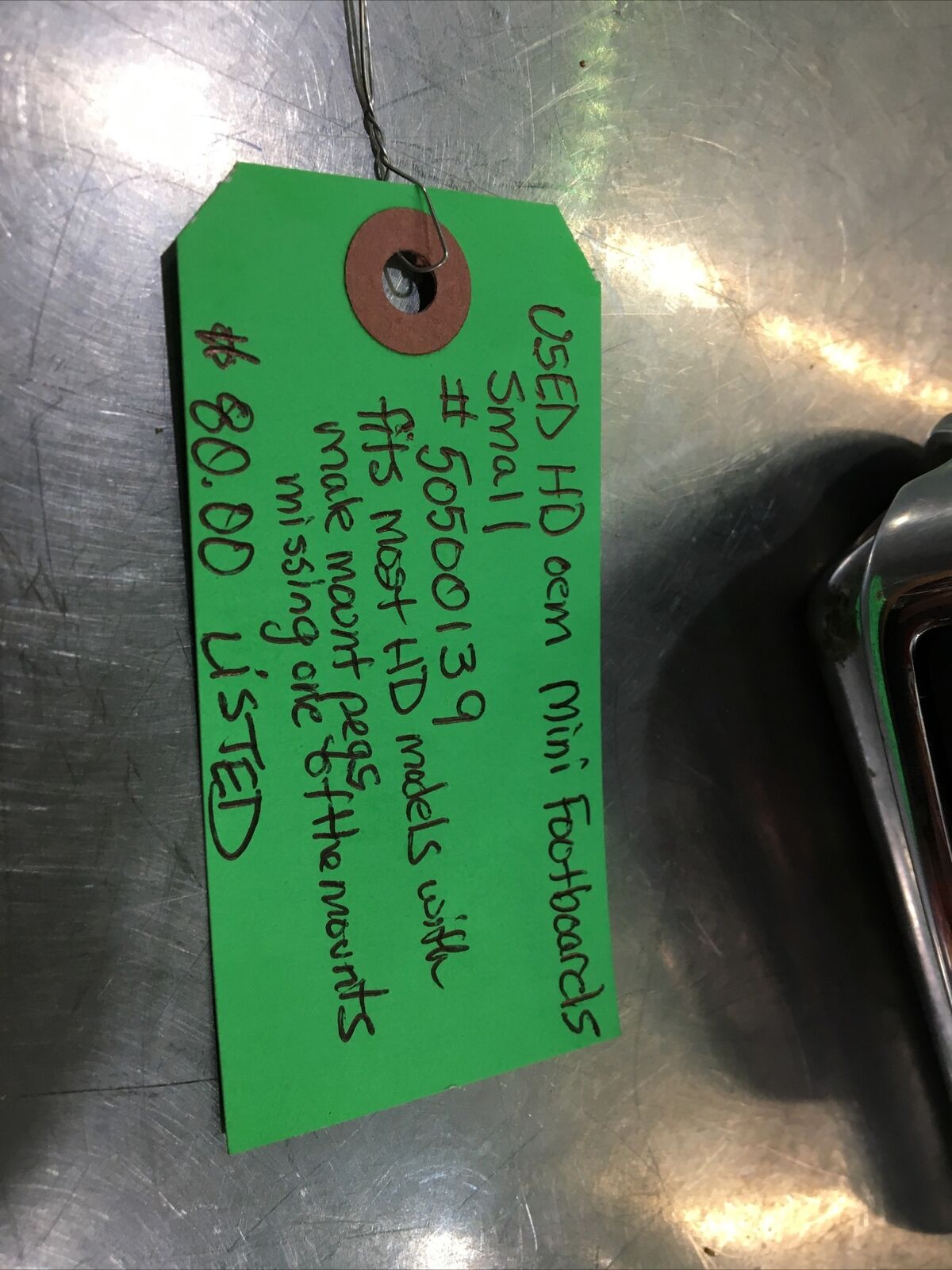Harley Davidson oem Mini Footboards Small #50500139. Condition is used. Missing one of the mounts. Fits most Harley Davidson models with male mount pegs buyer is responsible for fitment and applications