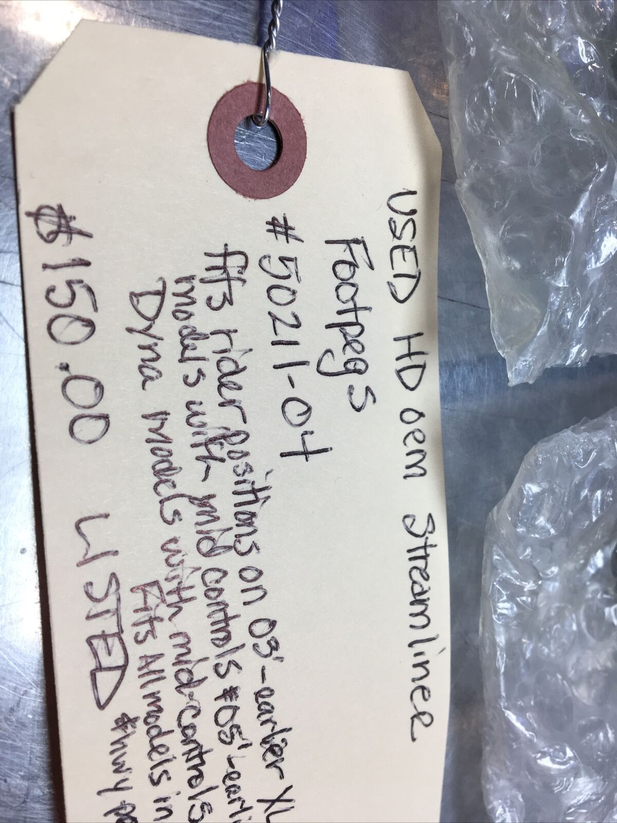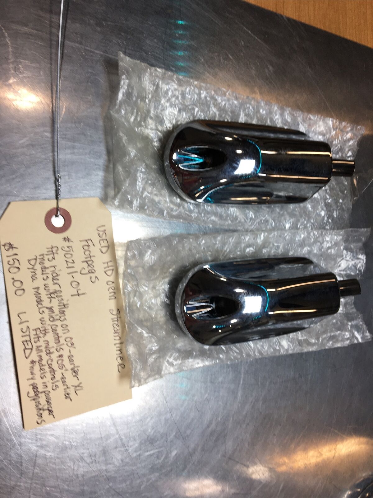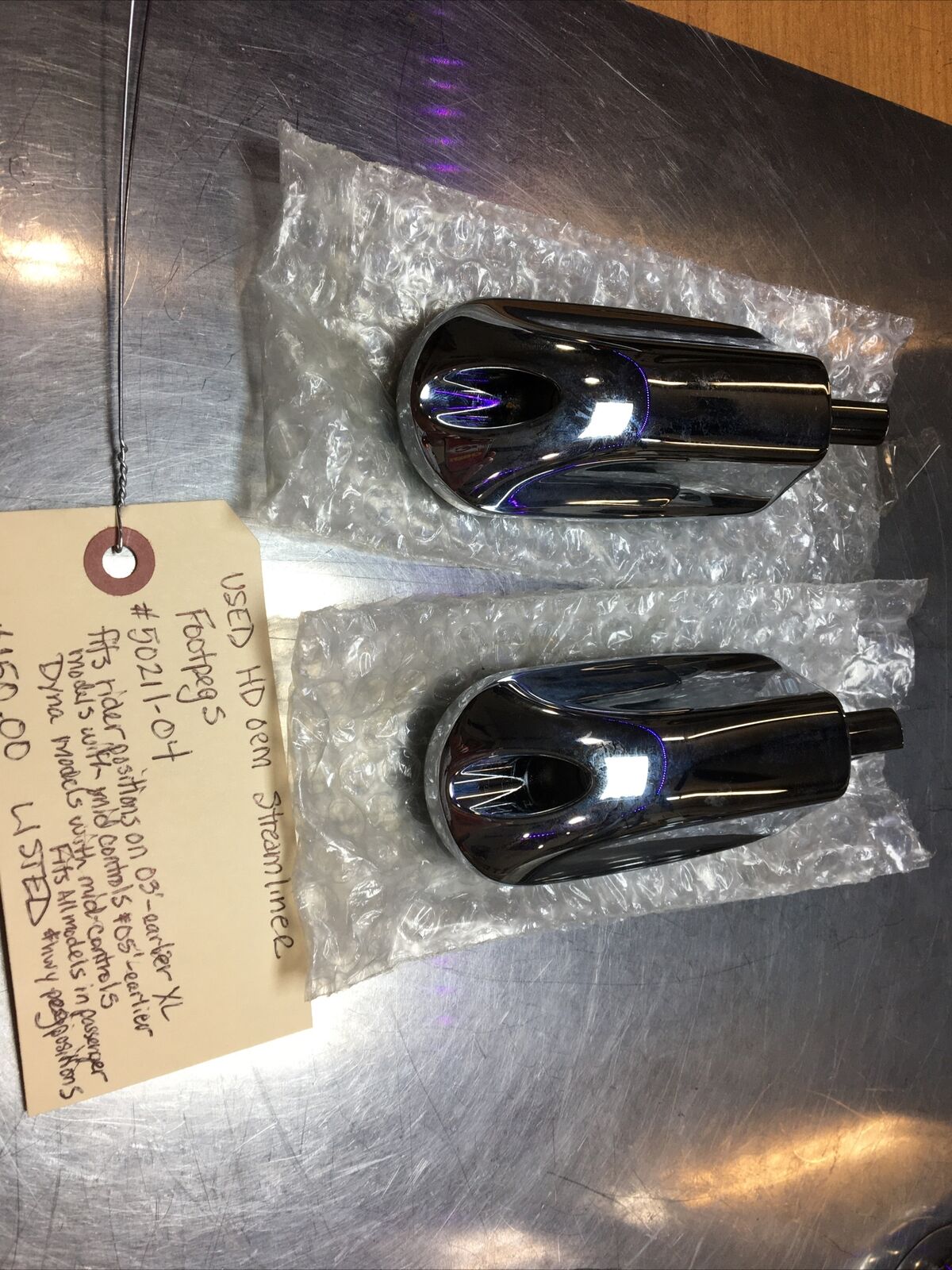 Harley Davidson oem Streamliner Footpegs #50211-04. Condition is used. Like new. Fits rider position on 03’-earlier XL models with mid controls and 05’-earlier Dyna models with mid controls fits all models in passenger and highway peg positions. Buyer is responsible for fitment and applications