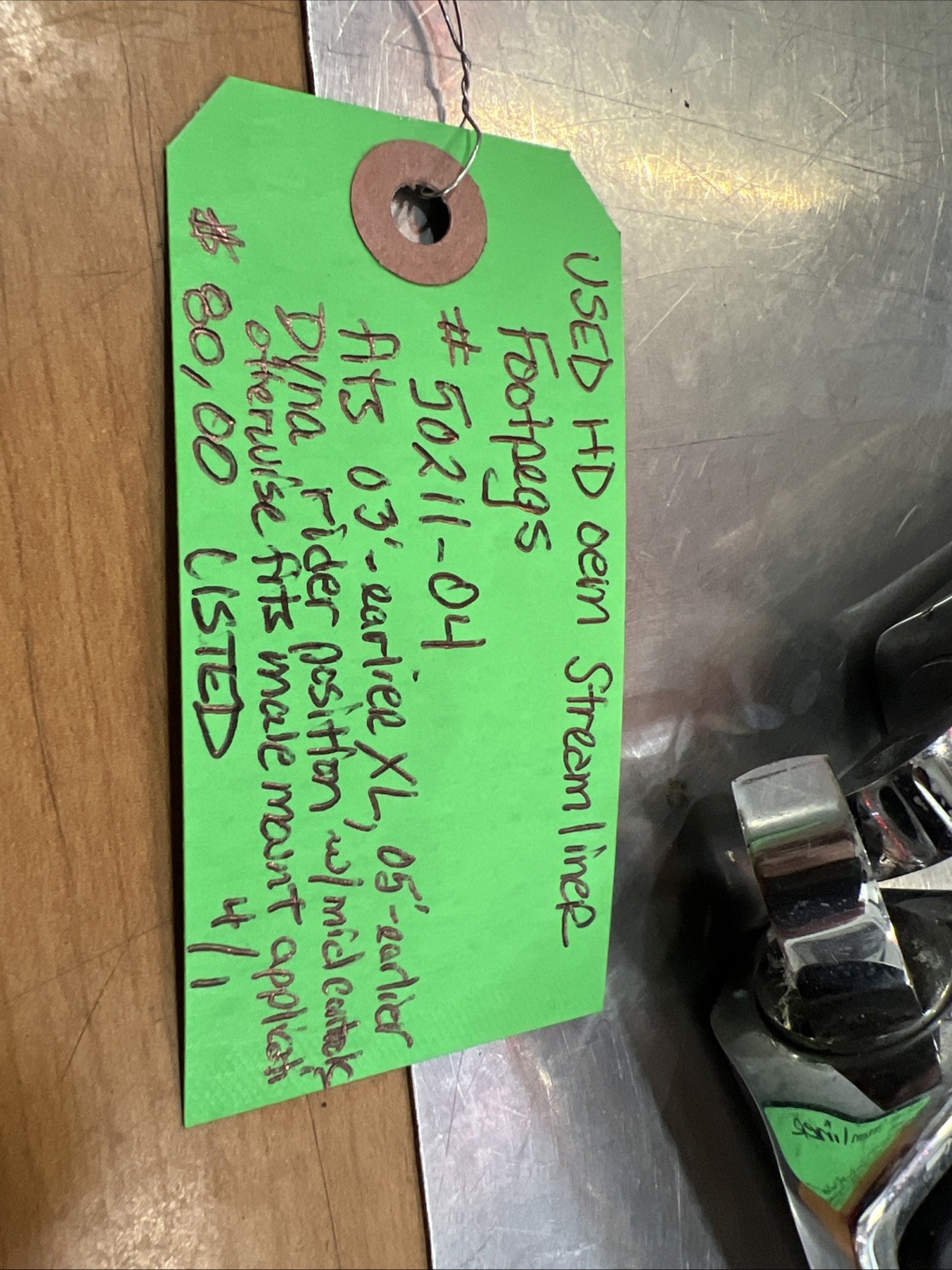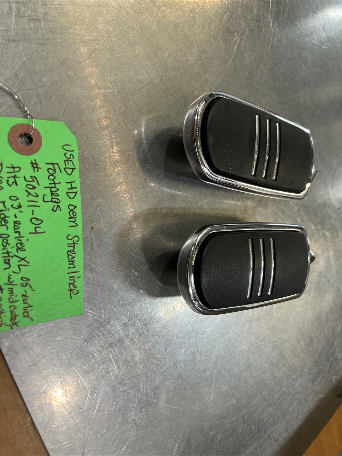 Harley Davidson oem Streamliner Footpegs #50211-04. Condition is used. Fits 03’-earlier XL, 05’-earlier Dyna rider position with mid controls and fits male mount applications buyer is responsible for fitment and applications