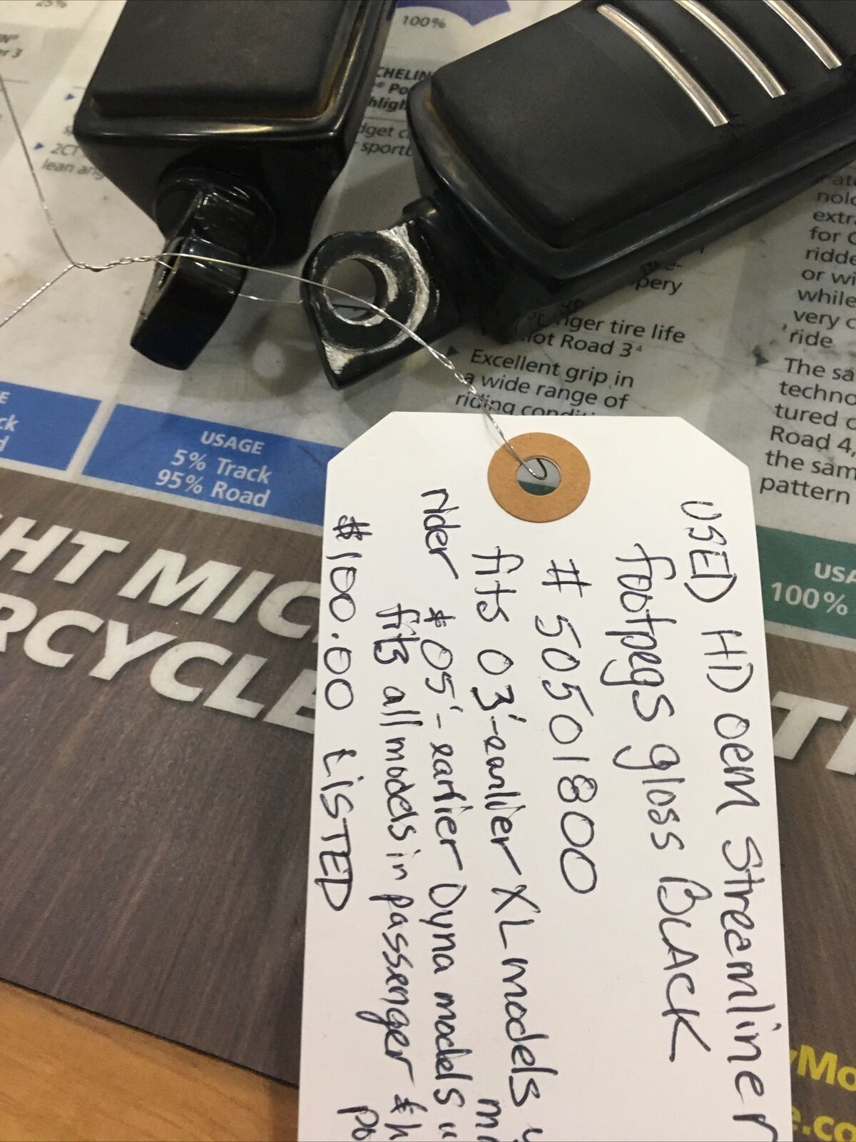 Harley Davidson oem Streamliner footpegs gloss black #50501800. Condition is used. Fits 03’-earlier XL models with mid controls and 05’-earlier Dyna models with mid controls in the rider position. Fits all models in passenger and highway positions buyer is responsible for fitment and applications