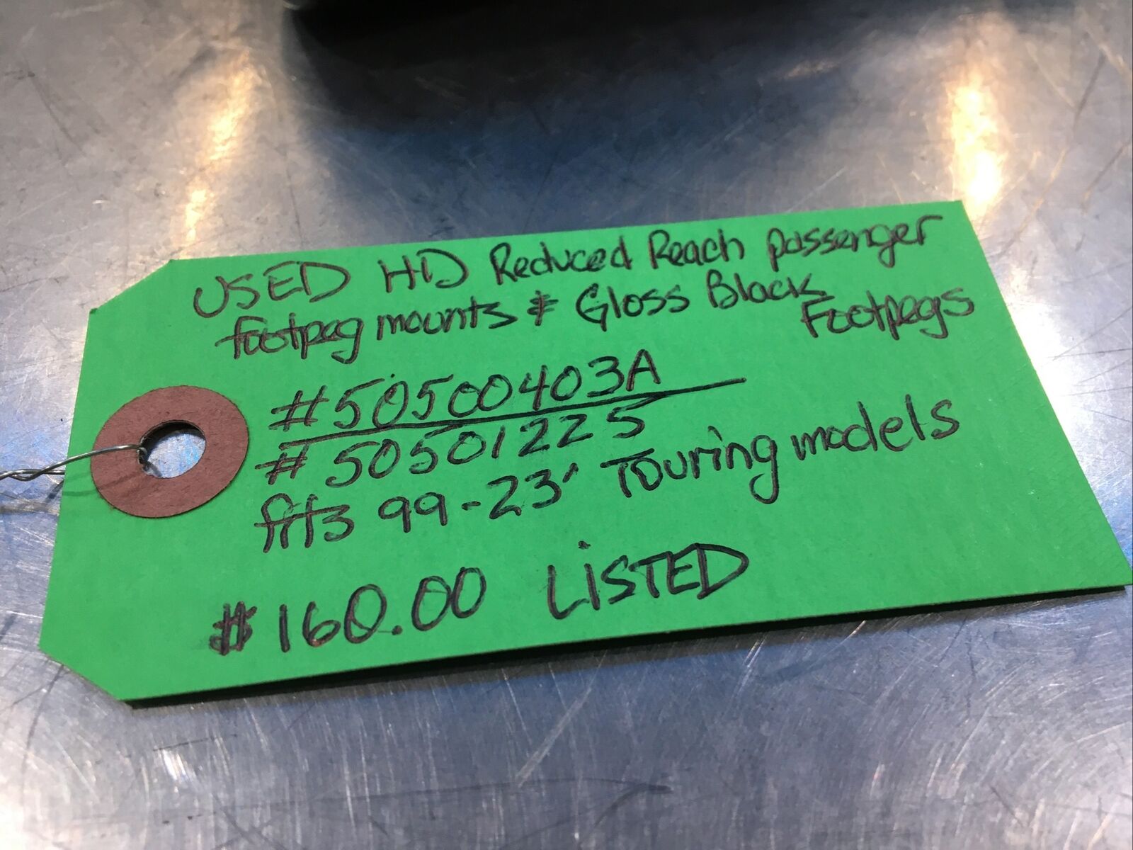 Harley Davidson Reduced Reach Passenger Footpeg mounts & Gloss Black Footpegs #50500403A/50501225. Condition is used. Fits 99-23’ Touring models buyer is responsible for fitment and applications
