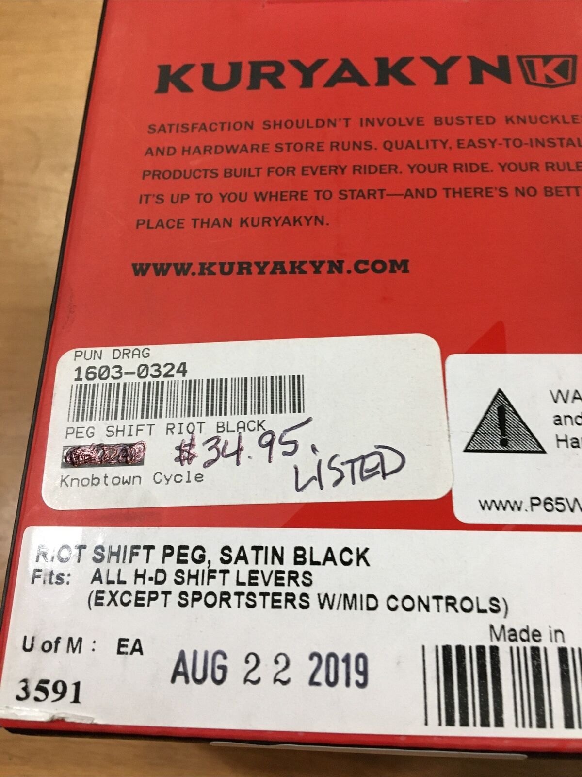 Kuryakyn Riot Shift Peg Black #1603-0324. Condition is new. Fits Harley Davidson Shift levers except Sportsters with Mid-Controls. Measures 2-1/2” length buyer is responsible for fitment and applications