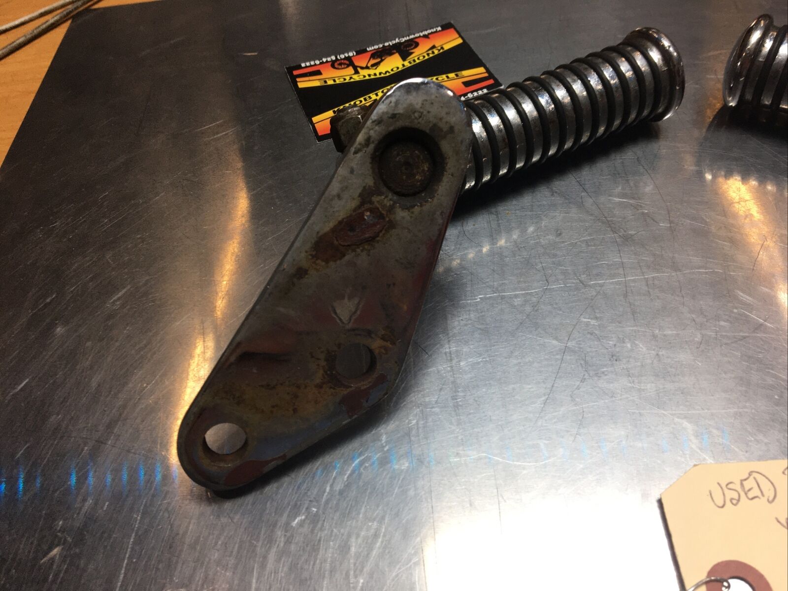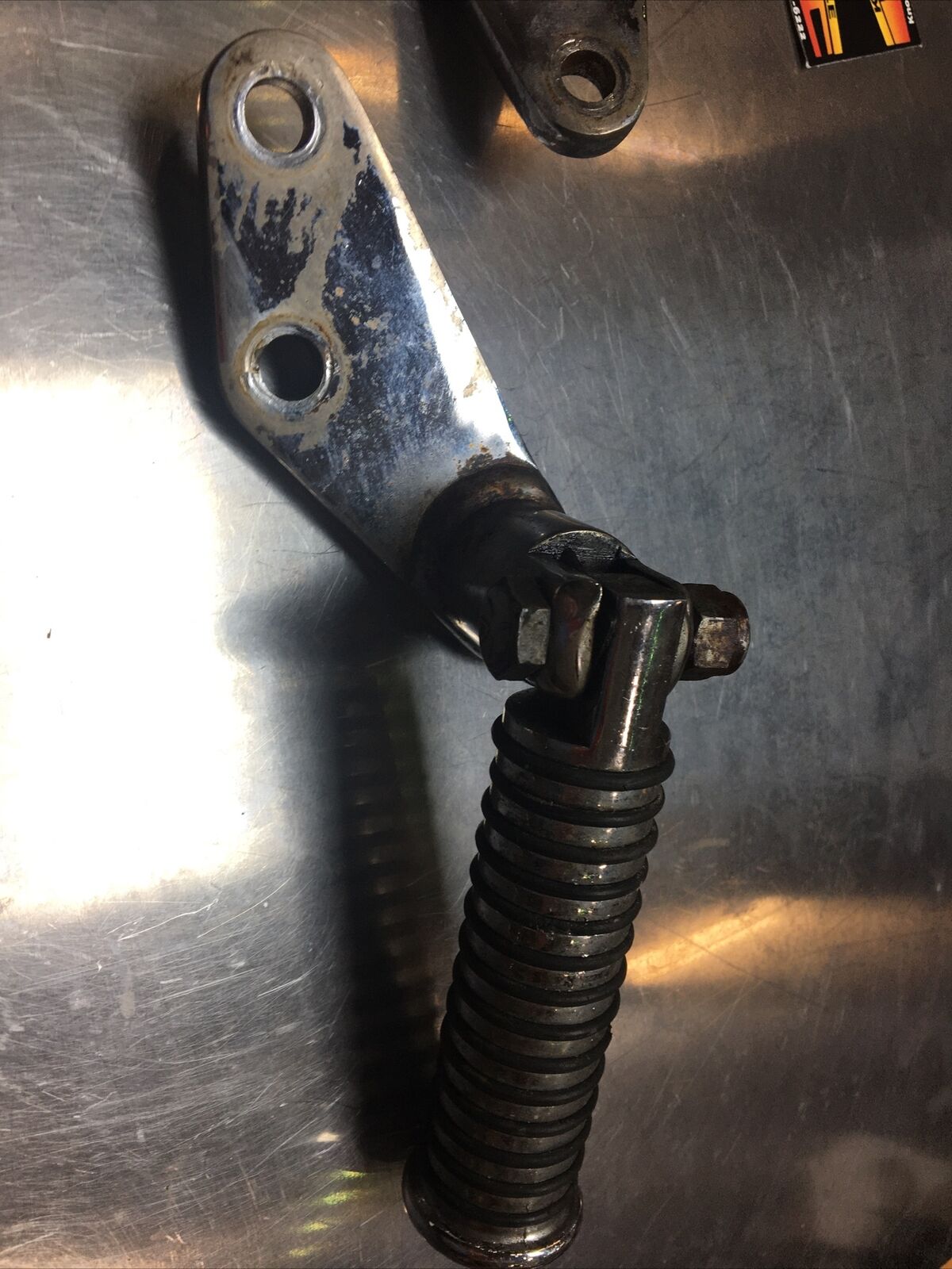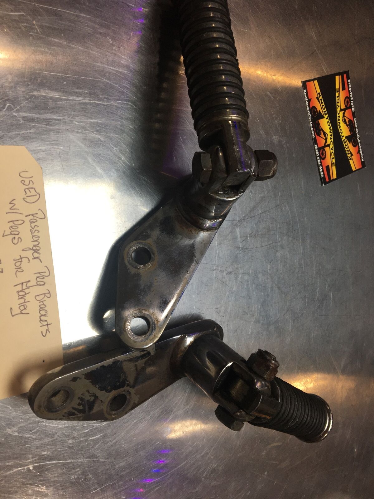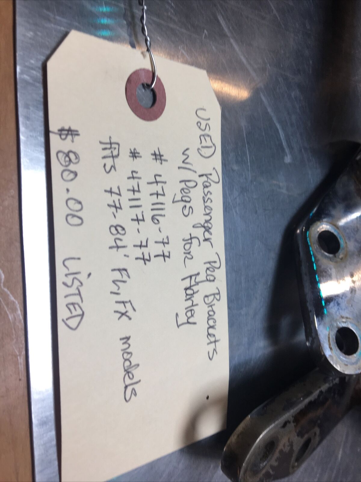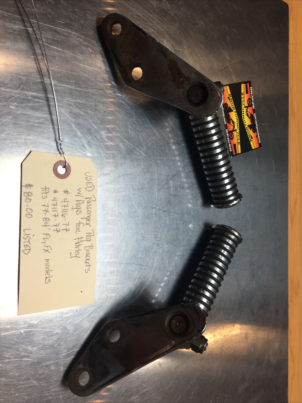 Passenger Peg Brackets w/Pegs for Harley #47116-77/47117-77. Condition is used. Fits Harley Davidson 77-84’ FL, FX models buyer is responsible for fitment and applications