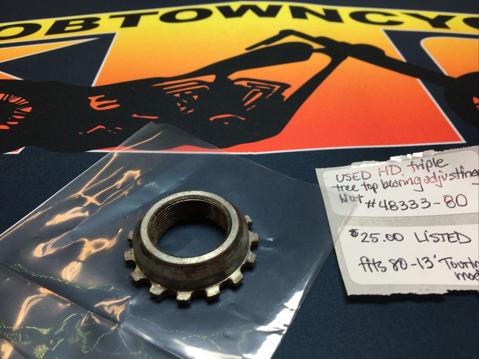 Harley Davidson Triple Tree Top Bearing Adjusting Nut #48333-80. Condition is used. Fits 80-13’ Touring models buyer is responsible for fitment and applications