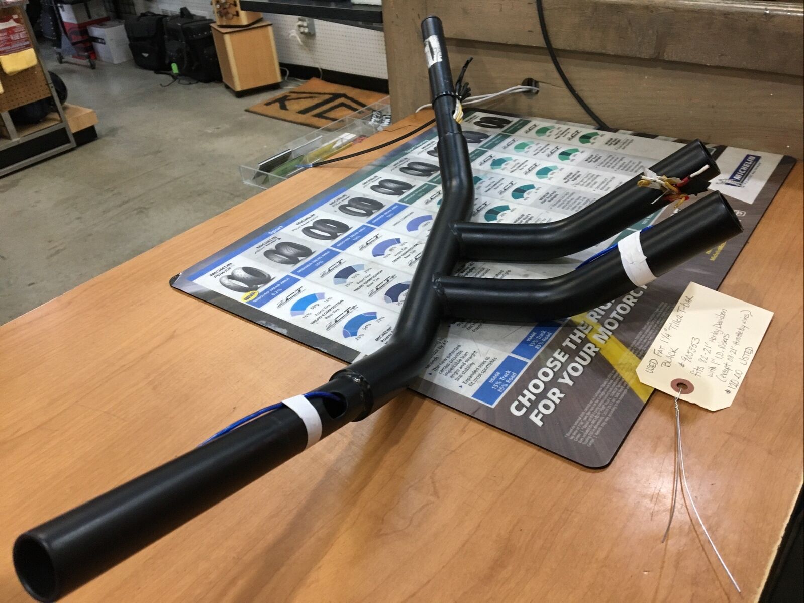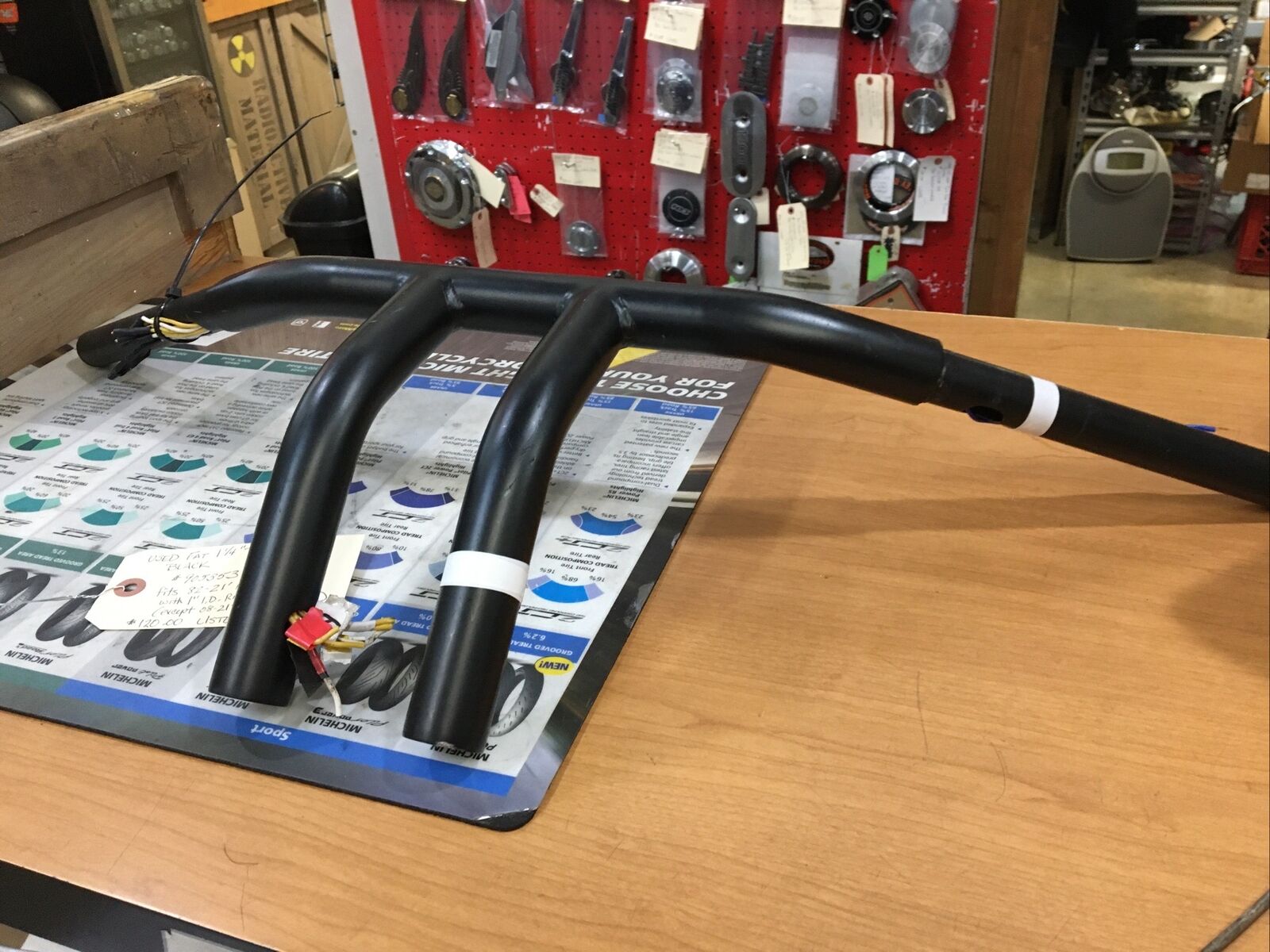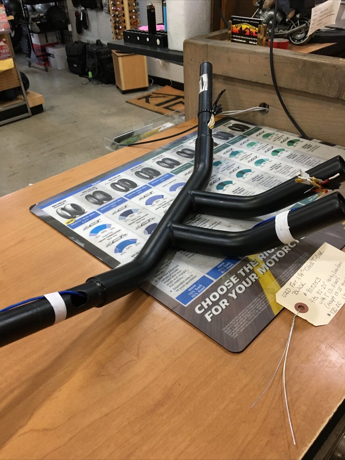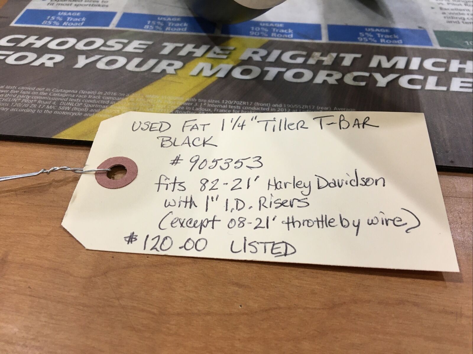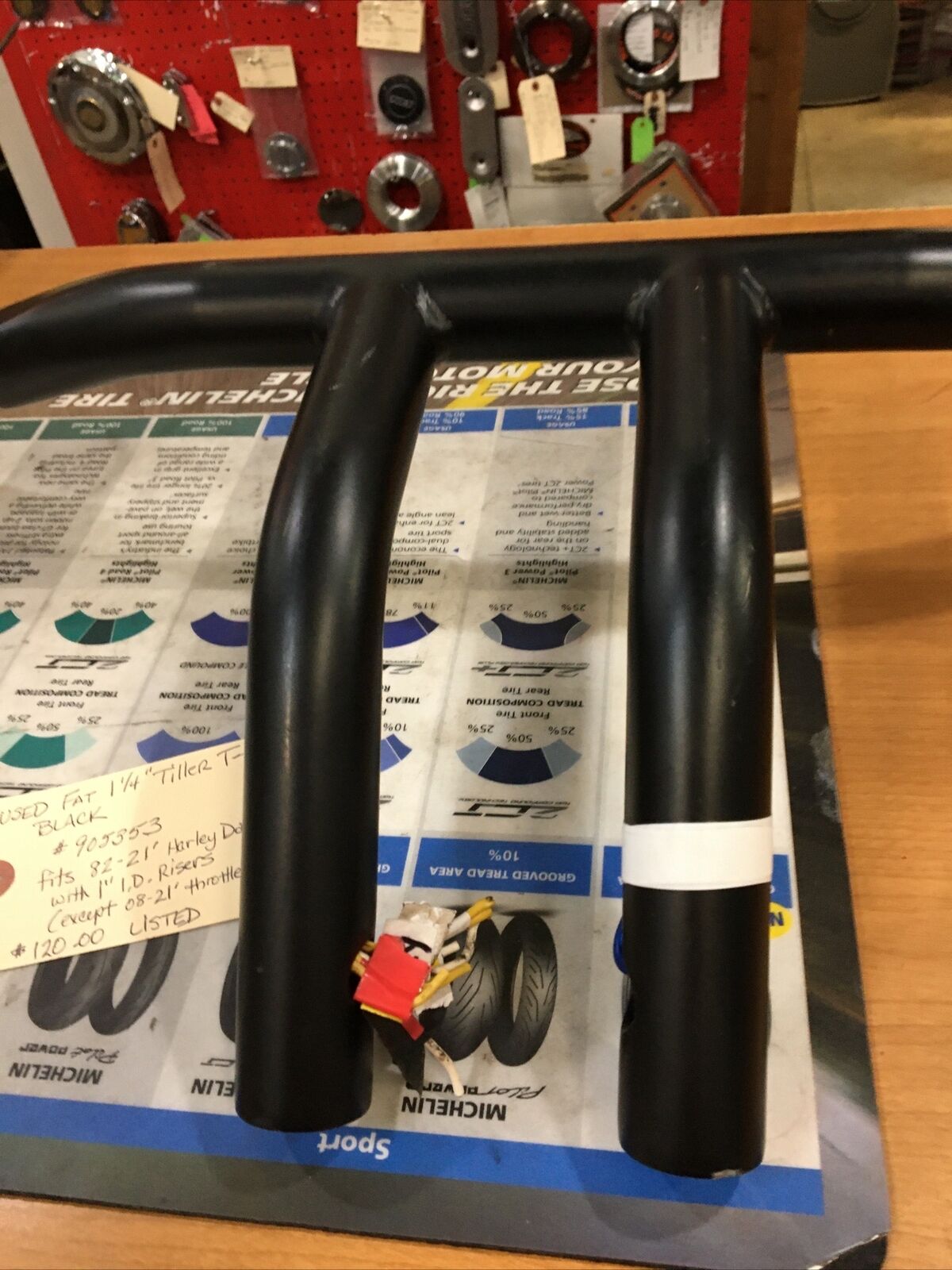 Fat 1-1/4” Tiller T-Bar Black #905353. Condition is used. 1” diameter where controls go. 29” width, 8” Rise, 11.5” Pullback. Fits 82-21’ Harley Davidson models with 1” I.D. Risers except 08-21’ models with throttle by wire buyer is responsible for fitment and applications