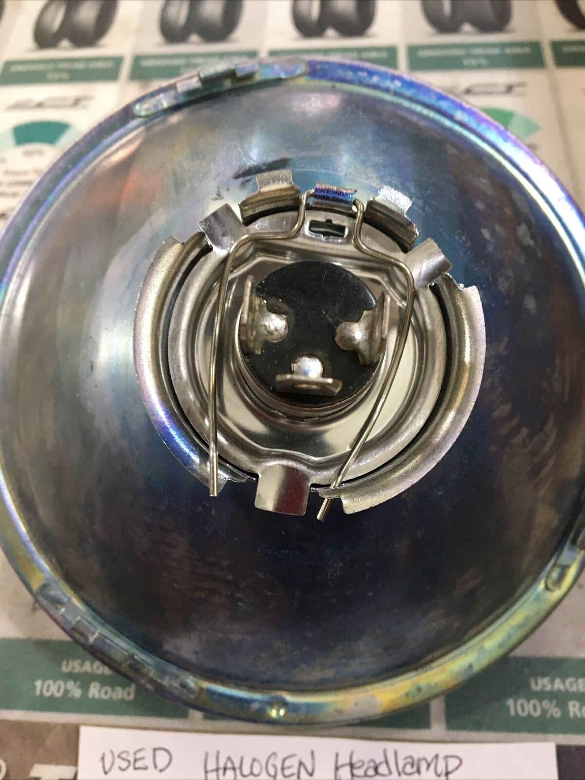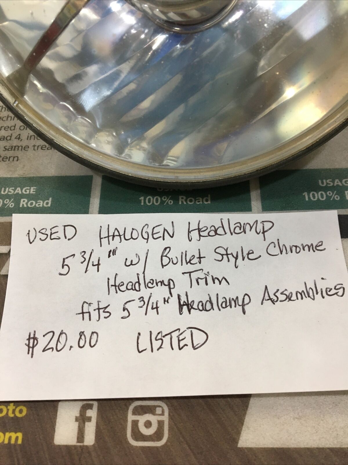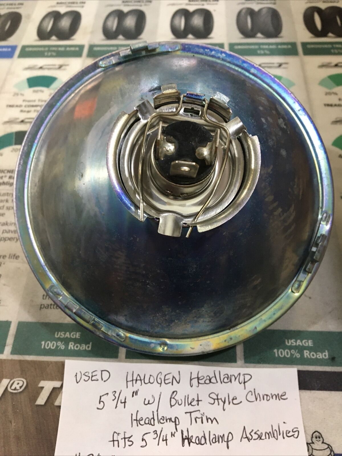 Halogen Headlamp 5-3/4” with Bullet Style Chrome Headlamp Trim. Condition is used. Fits 5-3/4” Headlamp Assemblies buyer is responsible for fitment and applications
