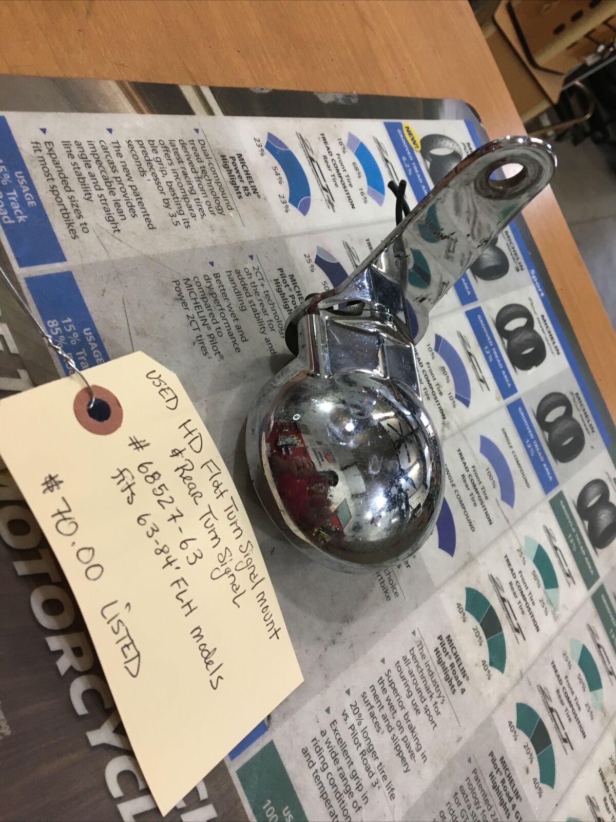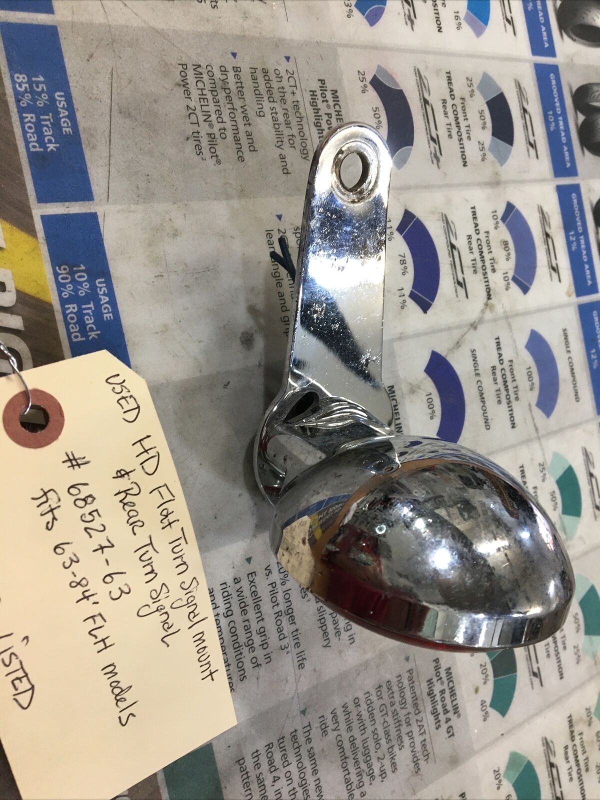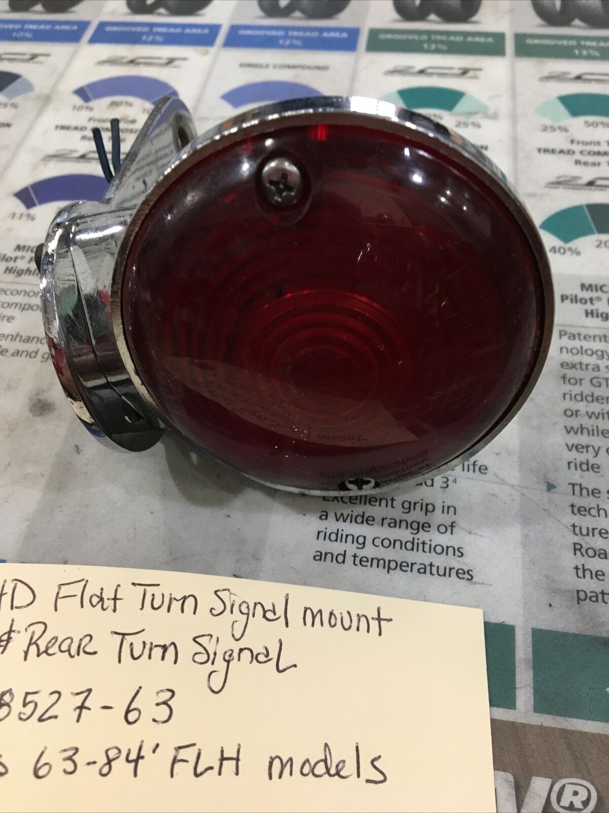 Harley Davidson Flat Turn Signal Mount and Rear Turn Signal #68527-63. Condition is used. Fits 63-84’ FLH models buyer is responsible for fitment and applications