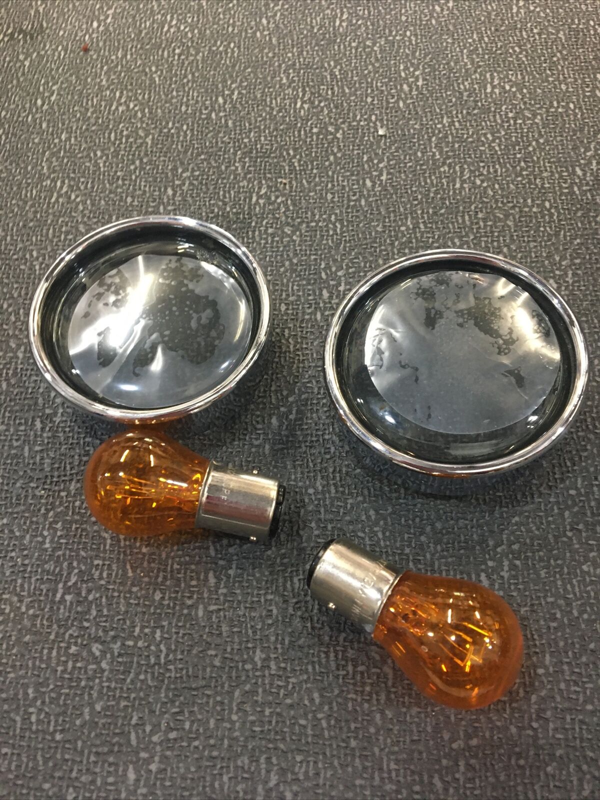 Harley Davidson front turn signal trim rings with smoked lenses/bulbs #69739-01. Condition is “Used”.