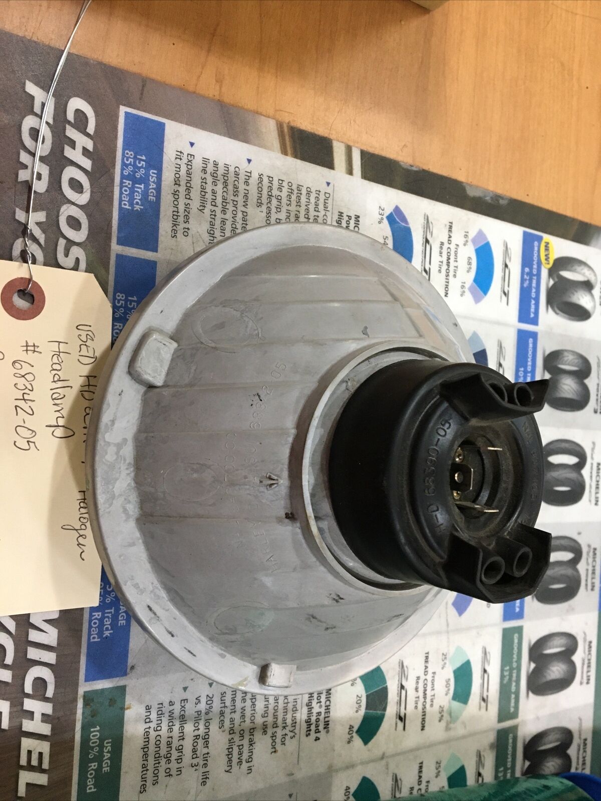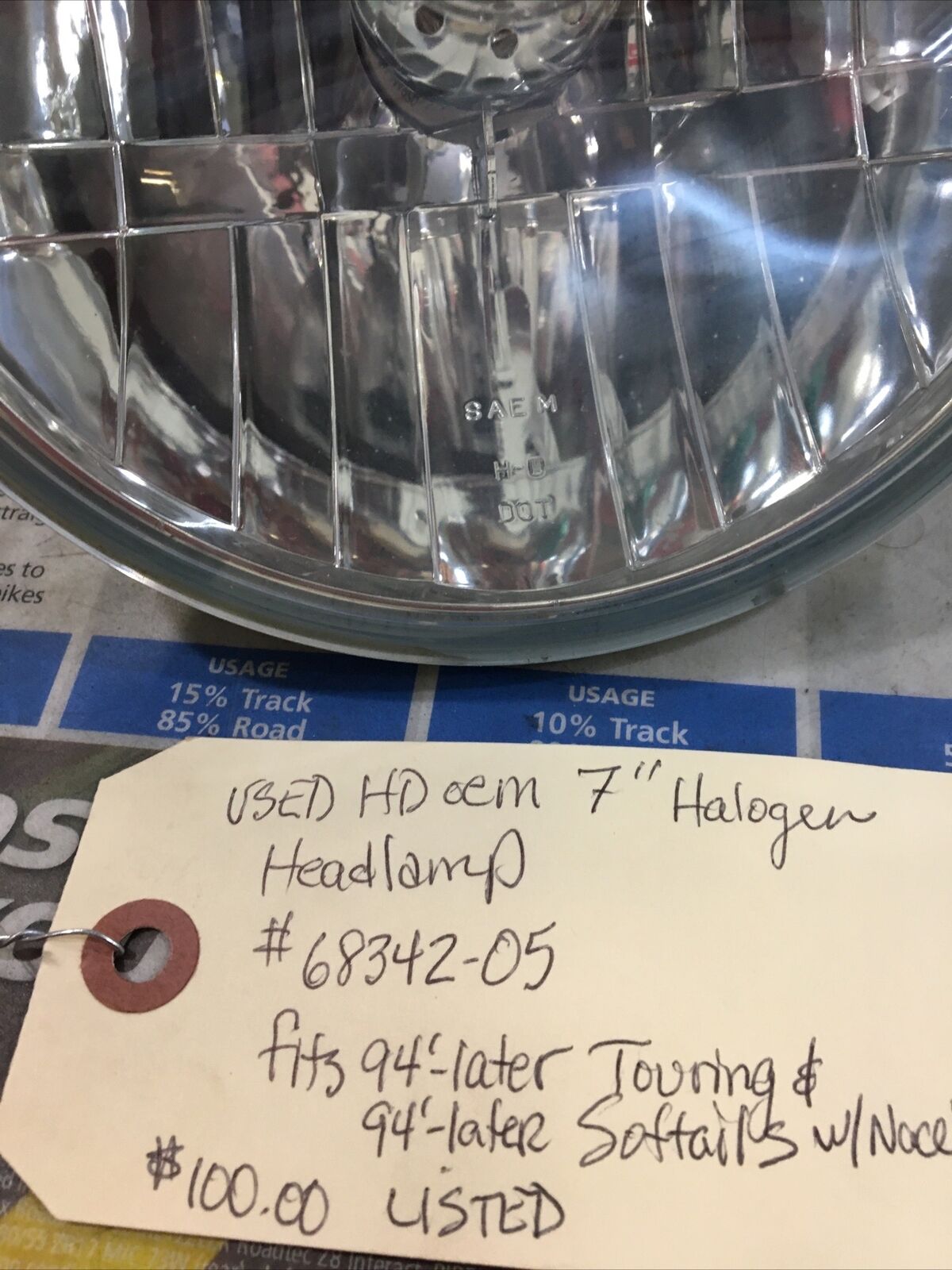 Harley Davidson oem 7” Halogen Headlamp #68342-05. Condition is used. Fits 94’-later Touring and 94’-later Softails with 7” headlight nacelle buyer is responsible for fitment and applications