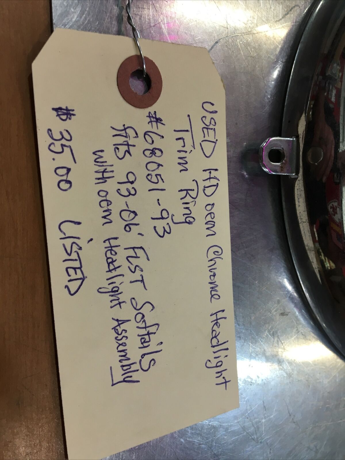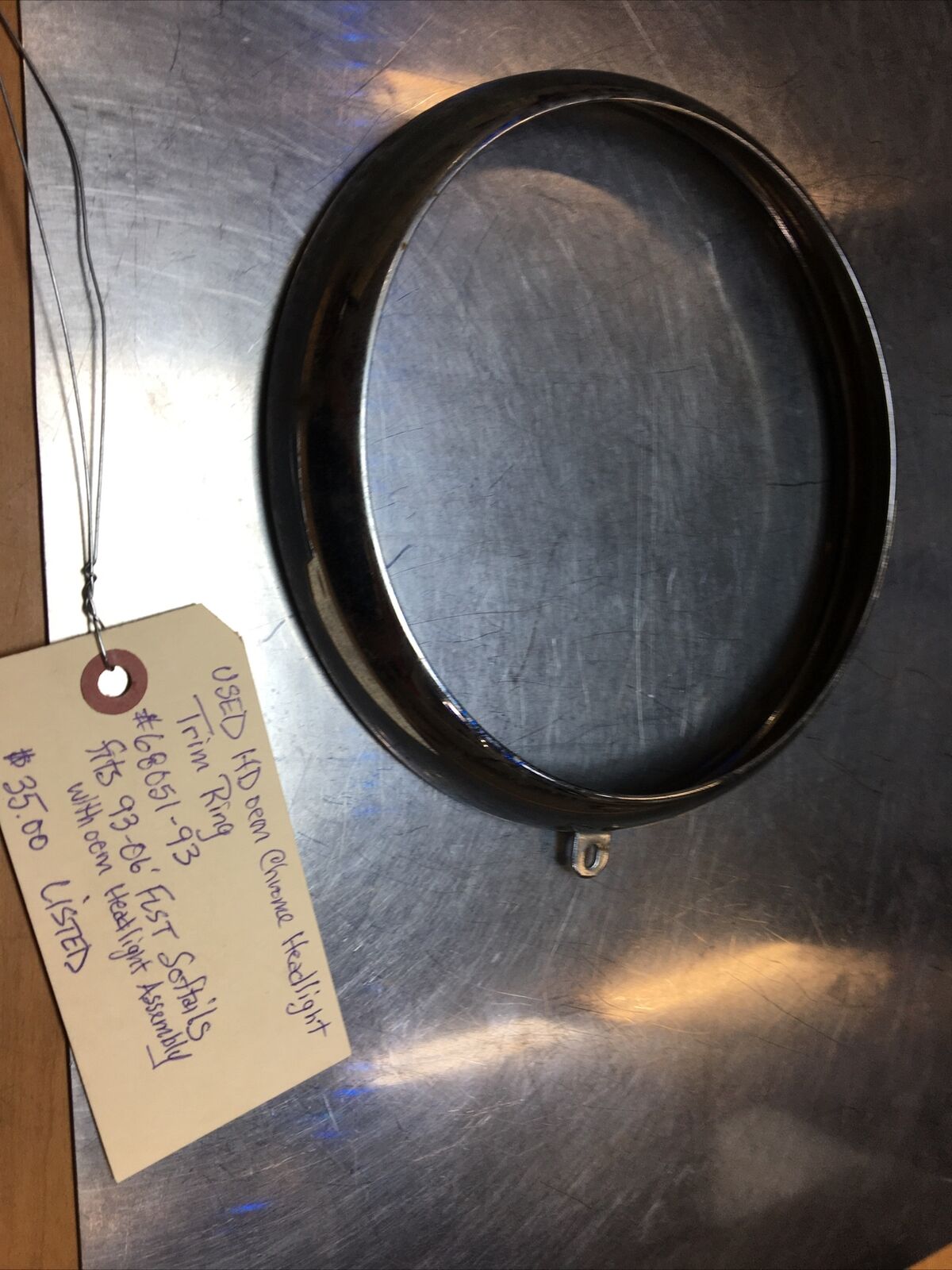 Harley Davidson oem Chrome Headlight Trim Ring #68051-93. Condition is used. Fits 93-06’ FLST Softails with oem headlight assembly buyer is responsible for fitment and applications