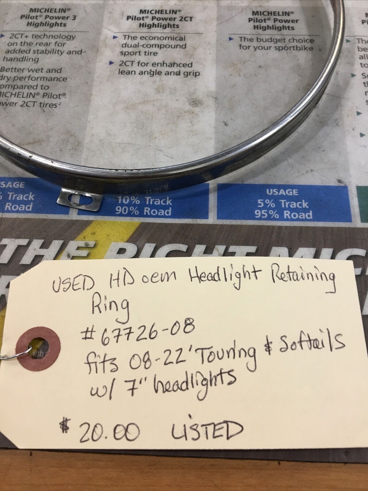 Harley Davidson oem Headlight Retaining Ring #67726-08. Condition is used. Fits 08-22’ Touring and Softails with 7” headlights buyer is responsible for fitment and applications