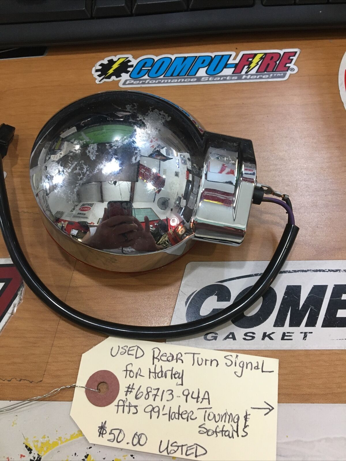 Rear Turn Signal for Harley #68713-94A. Condition is used also the mounting holes are not threaded. Fits Harley Davidson 99’-later Touring and Softails buyer is responsible for fitment and applications