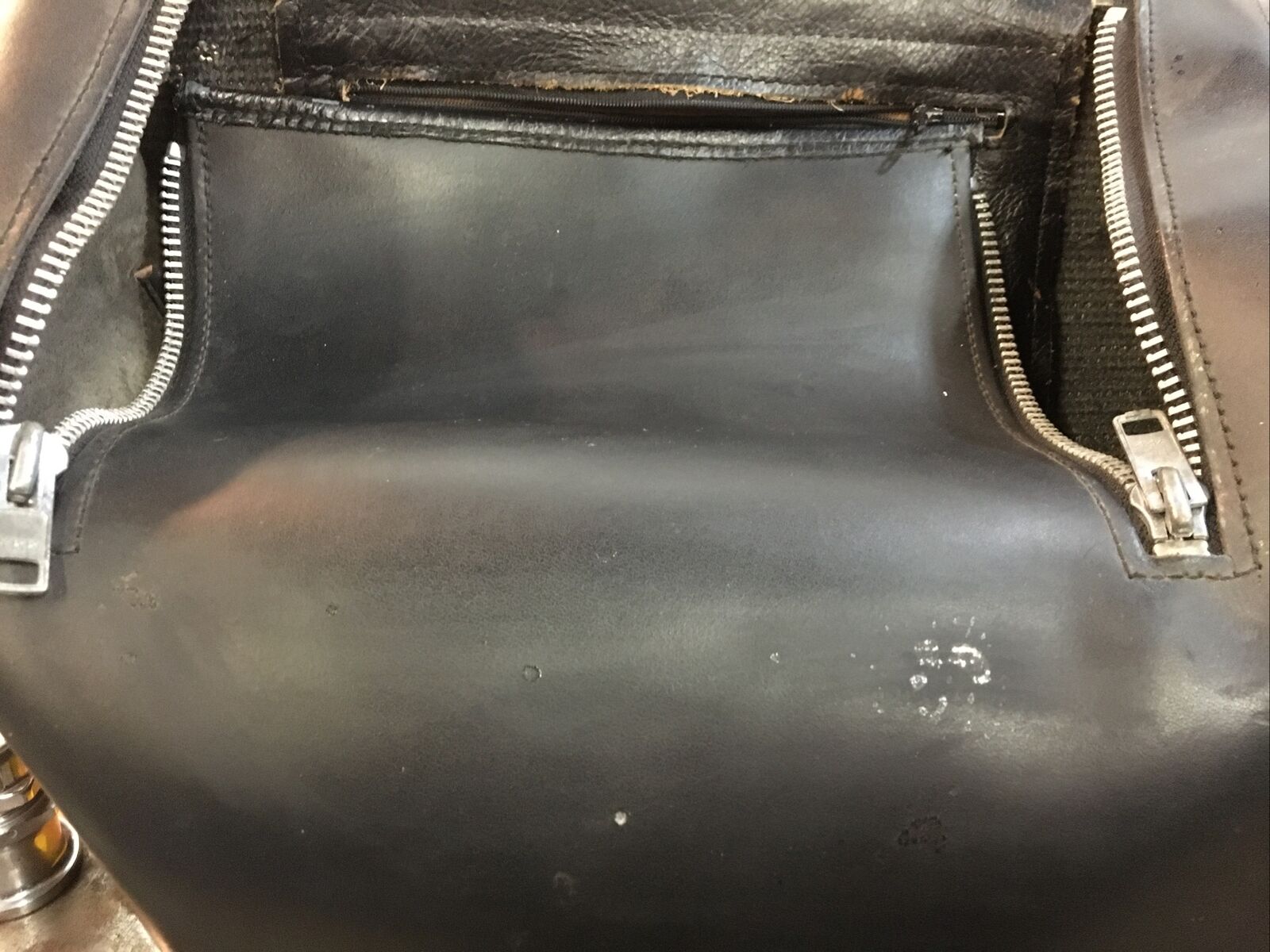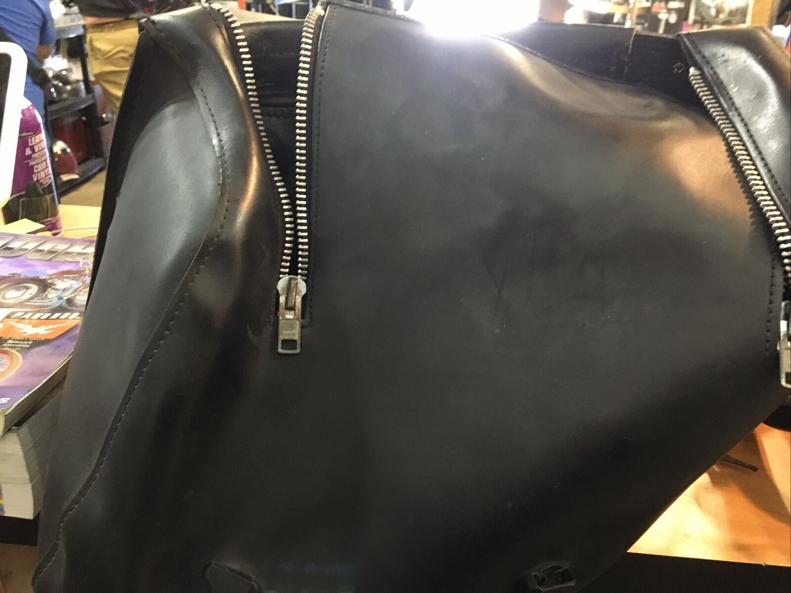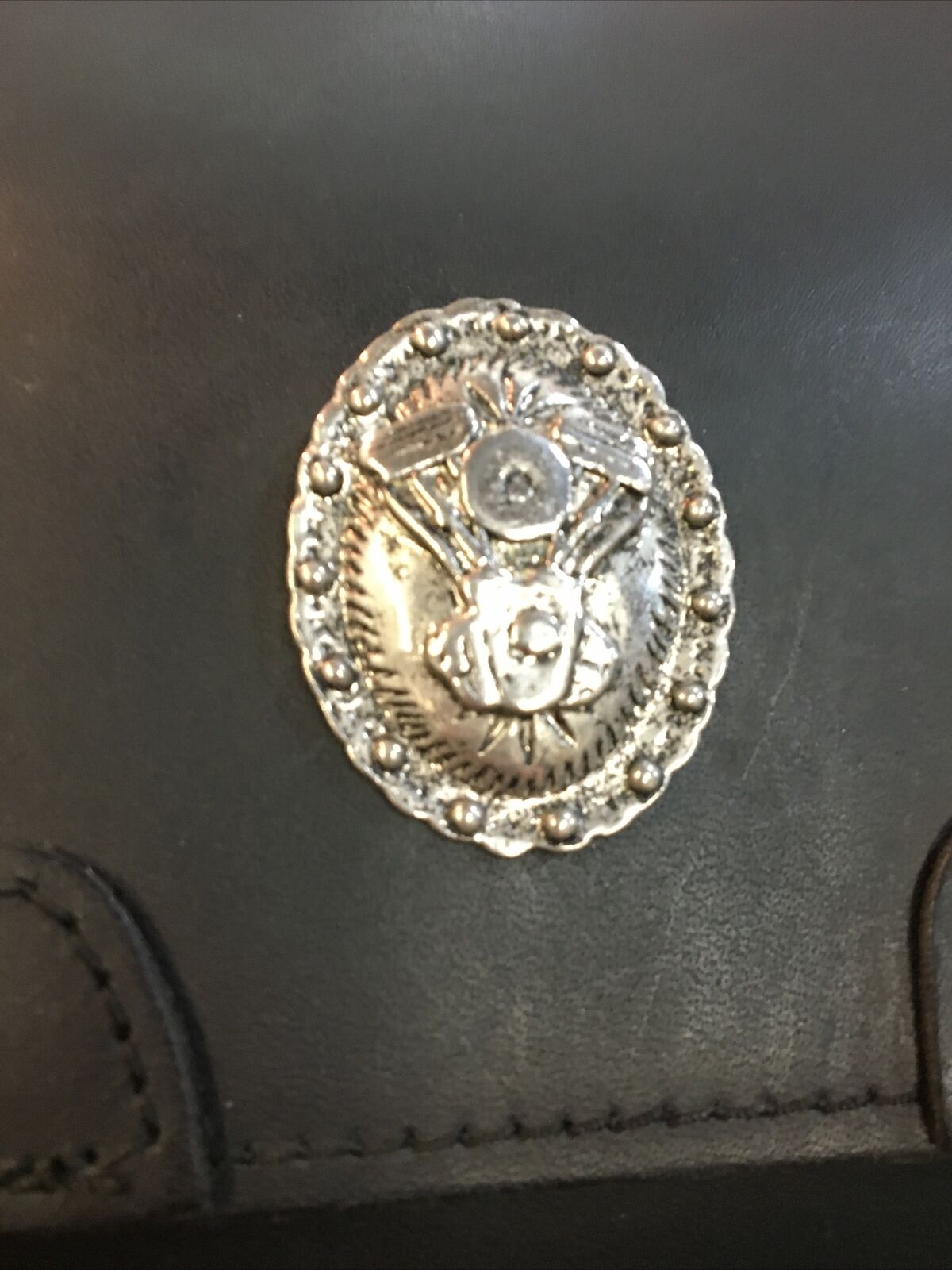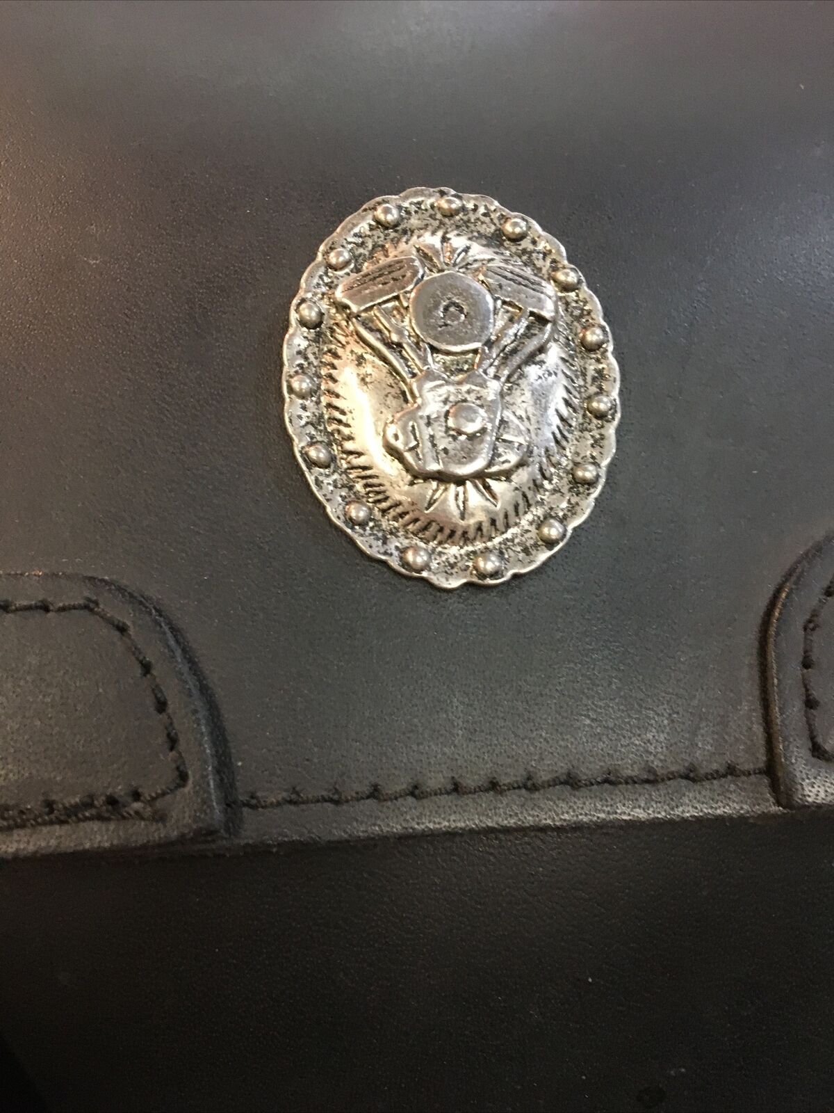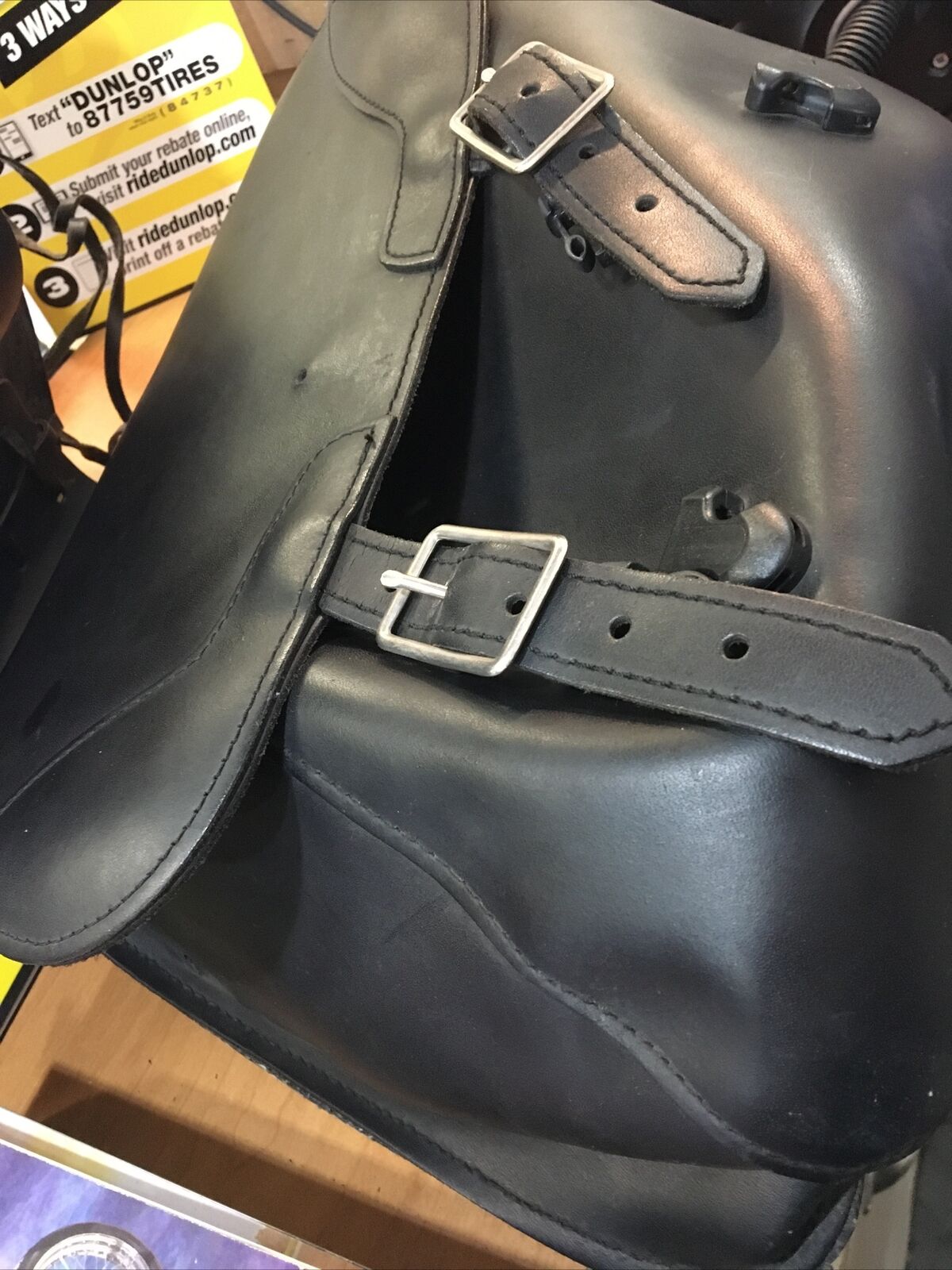Black Leather Throw Over Saddlebags. Condition is “Used”.one bag is missing a concho and the other bag has a hole in the bottom of bag buyer would need saddlebag supports and is responsible for fitment and applications no returns