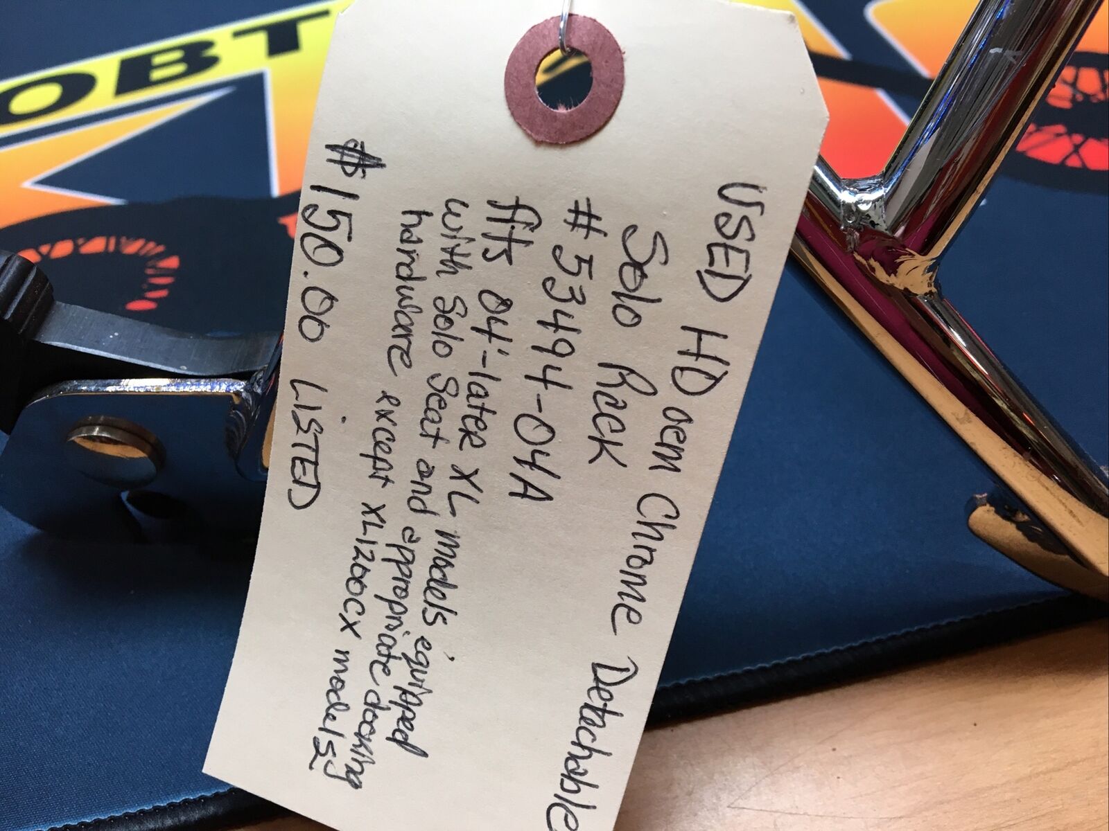 Harley Davidson oem Chrome Detachable Solo Rack #53494-04A. Condition is used. Fits 04’-later XL models equipped with solo seat and appropriate docking hardware except XL1200CX models buyer is responsible for fitment and applications