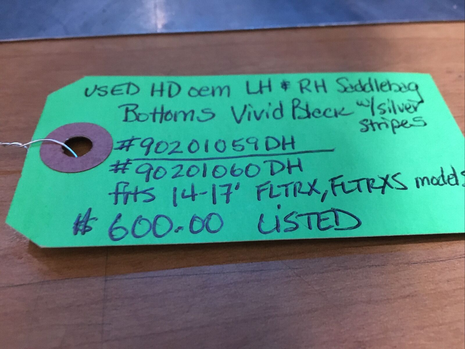 Harley Davidson oem LH & RH Saddlebag Bottoms Vivid Black w/Silver Stripes #90201059DH/90201060DH. Condition is used. Fits 14-17’ FLTRX, FLTRXS models buyer is responsible for fitment and applications