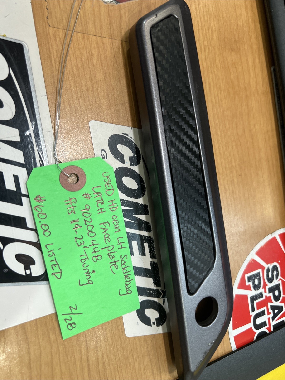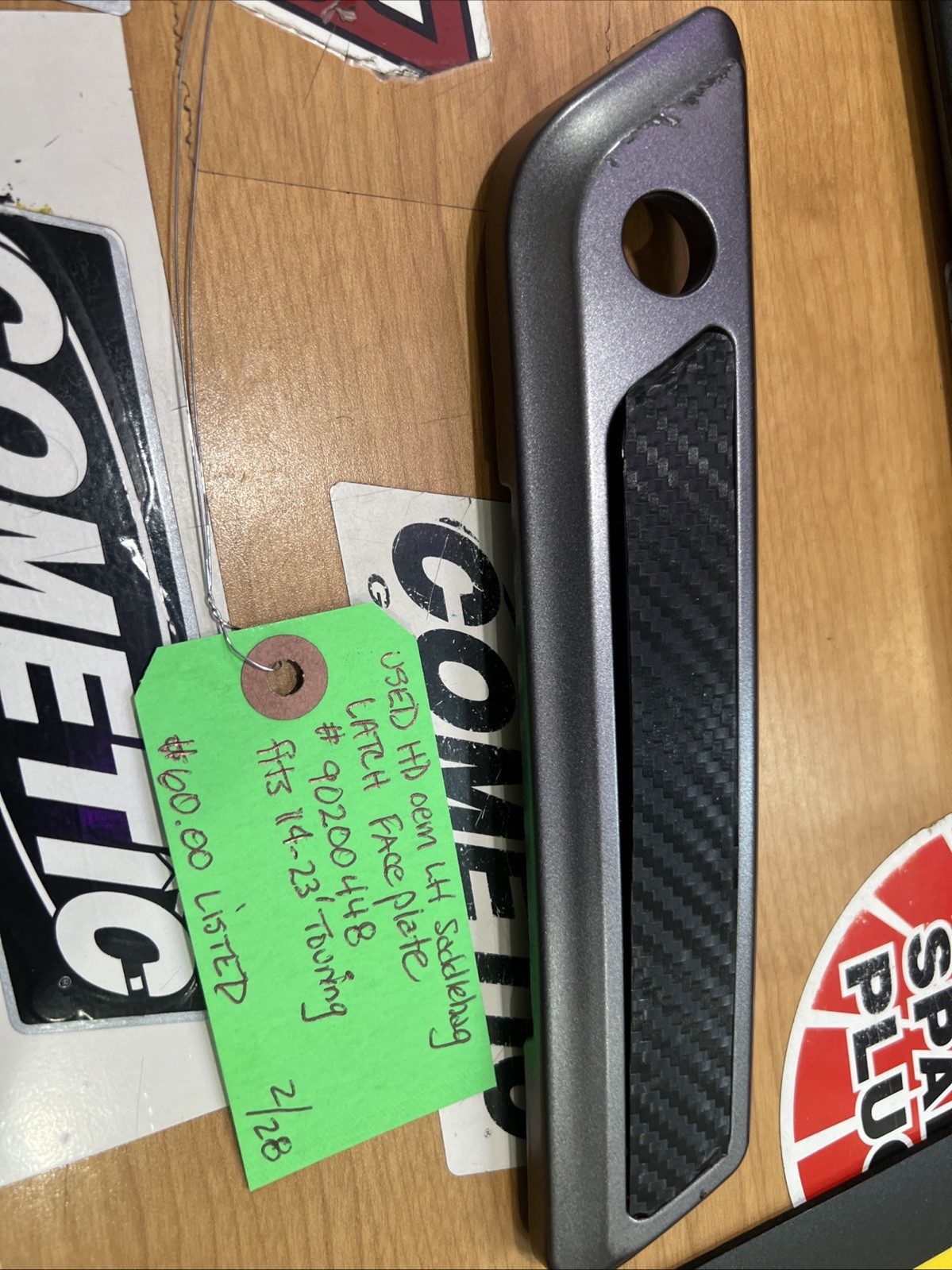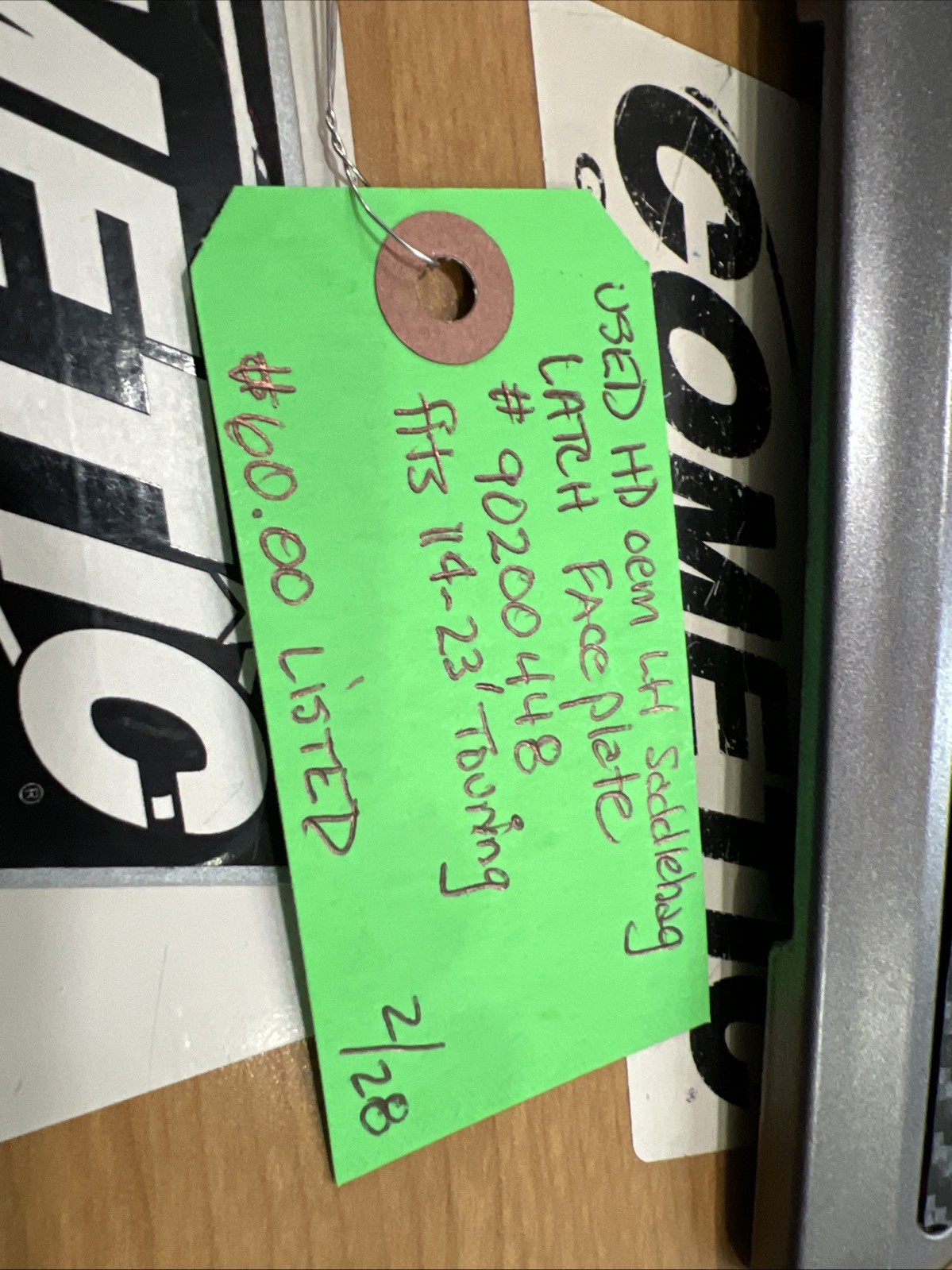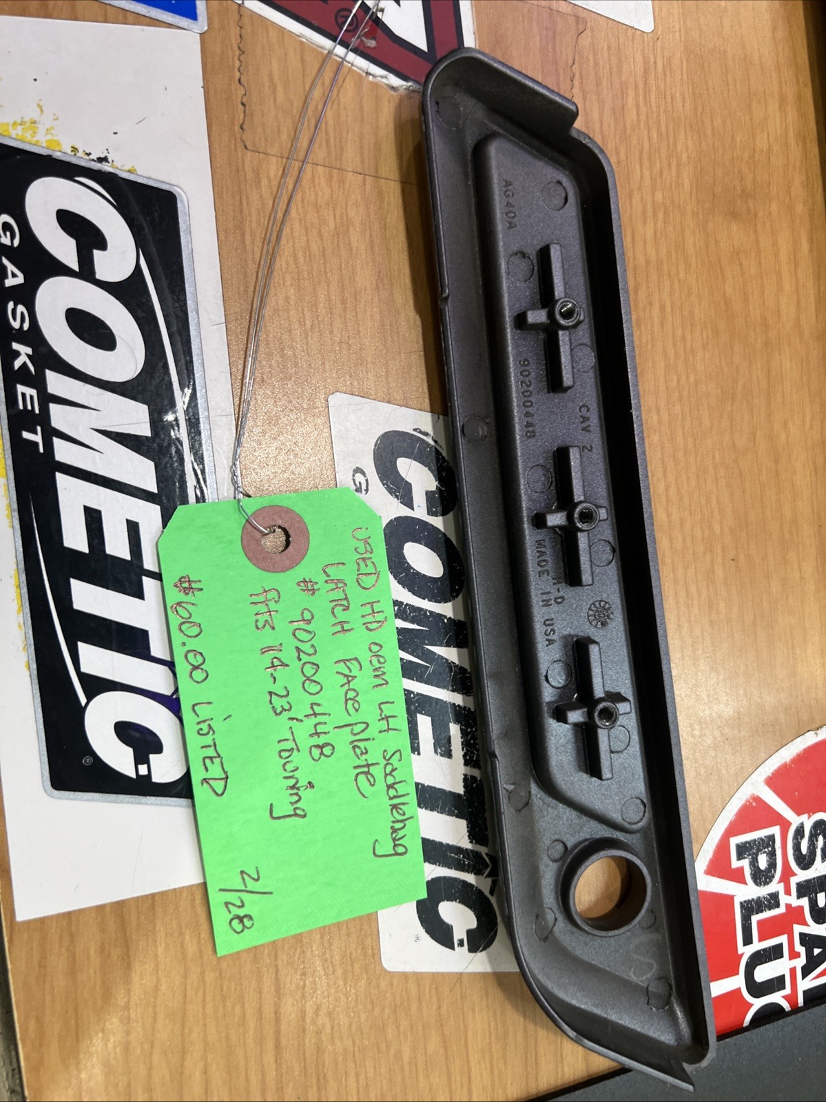 Harley Davidson oem LH Saddlebag Latch Face plate #90200448. Condition is used. Fits 14-23’ Touring Models buyer is responsible for fitment and applications
