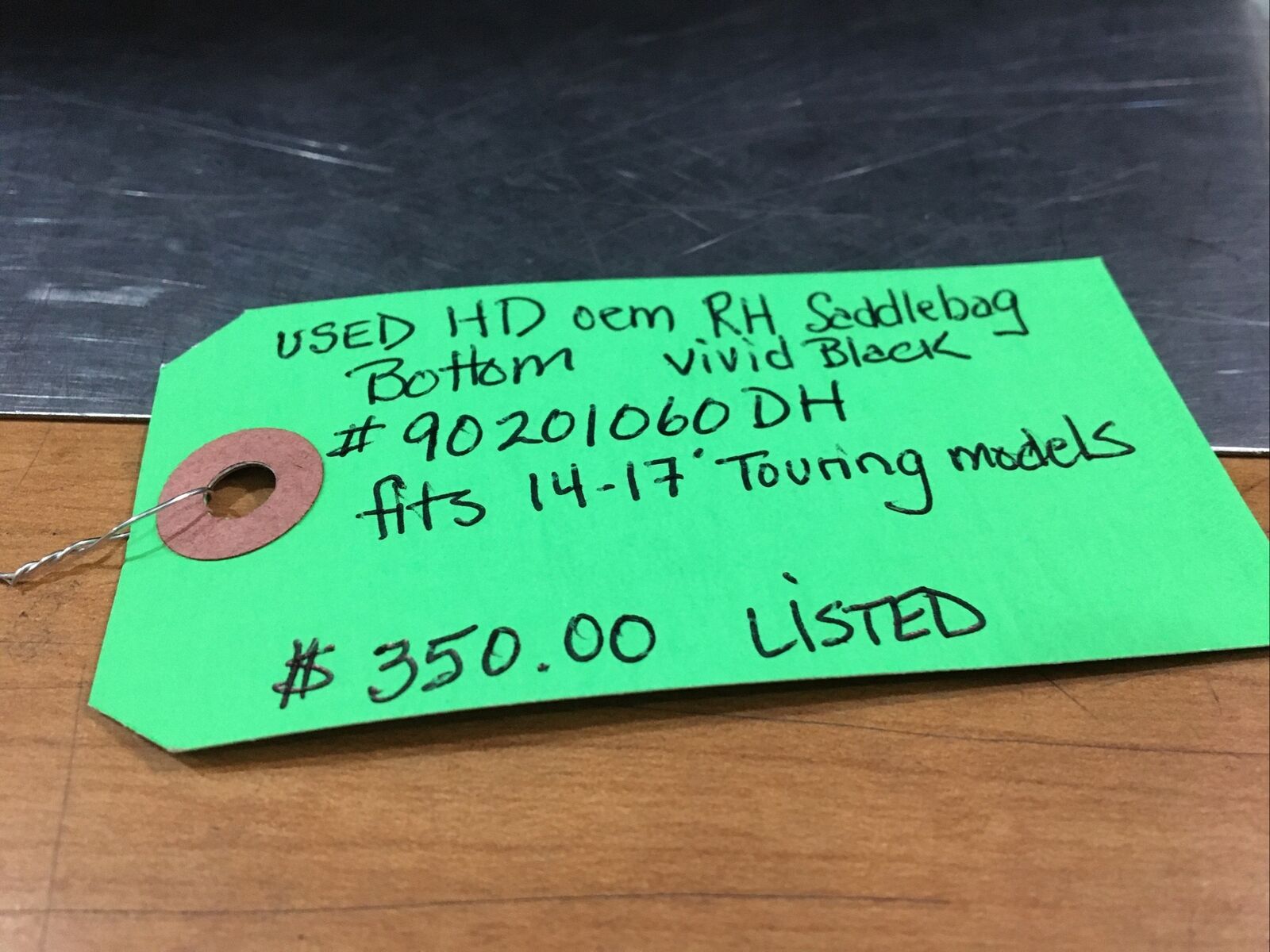 Harley Davidson oem RH Saddlebag Bottom Vivid Black #90201060DH. Condition is used. Fits 14-17’ Touring models buyer is responsible for fitment and applications