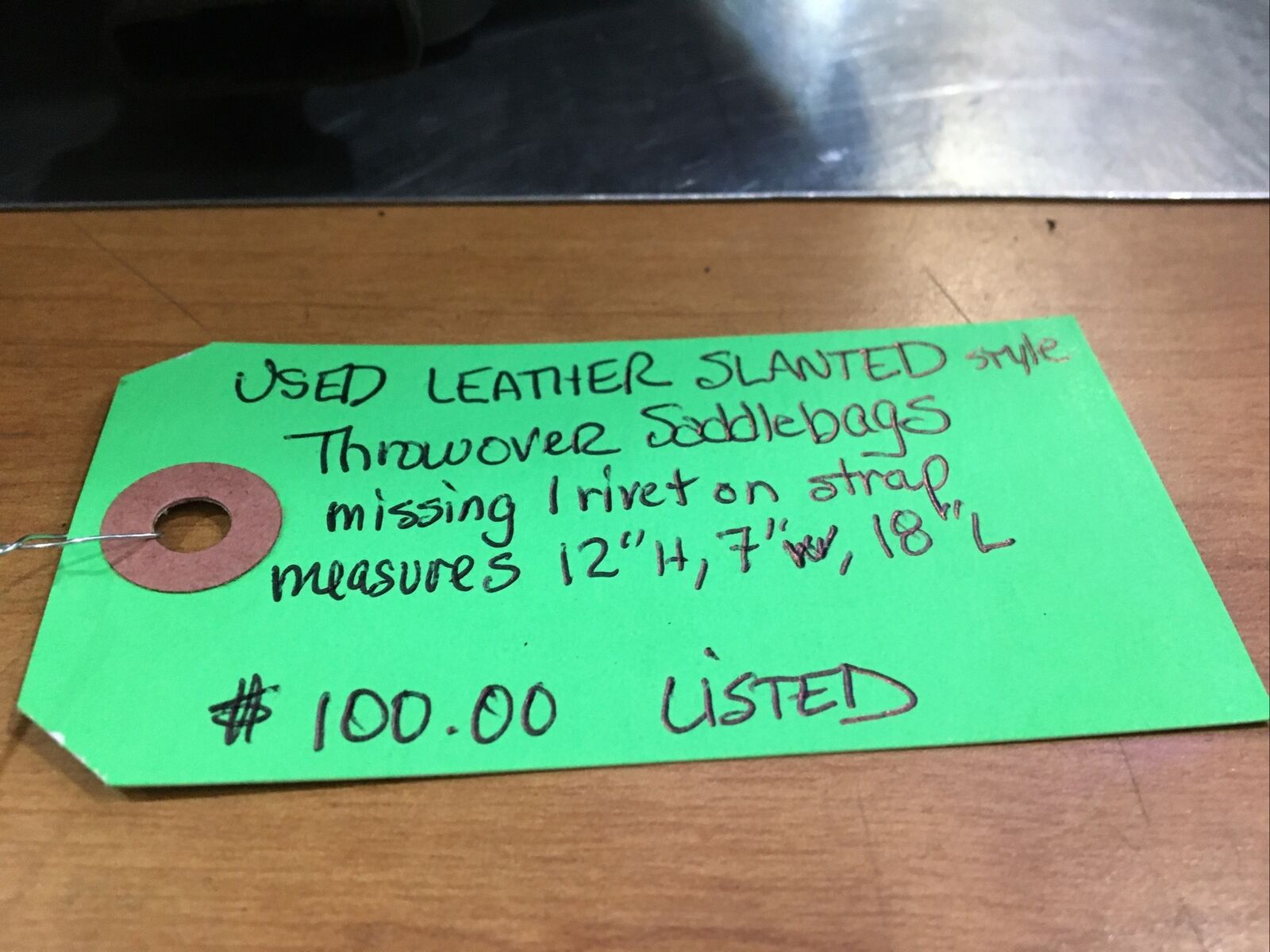 Leather Slanted Style Throw Over Saddlebags. Condition is used. Missing 1 rivet on strap. Measures 12” H, 7” W, 18” L buyer is responsible for fitment and applications