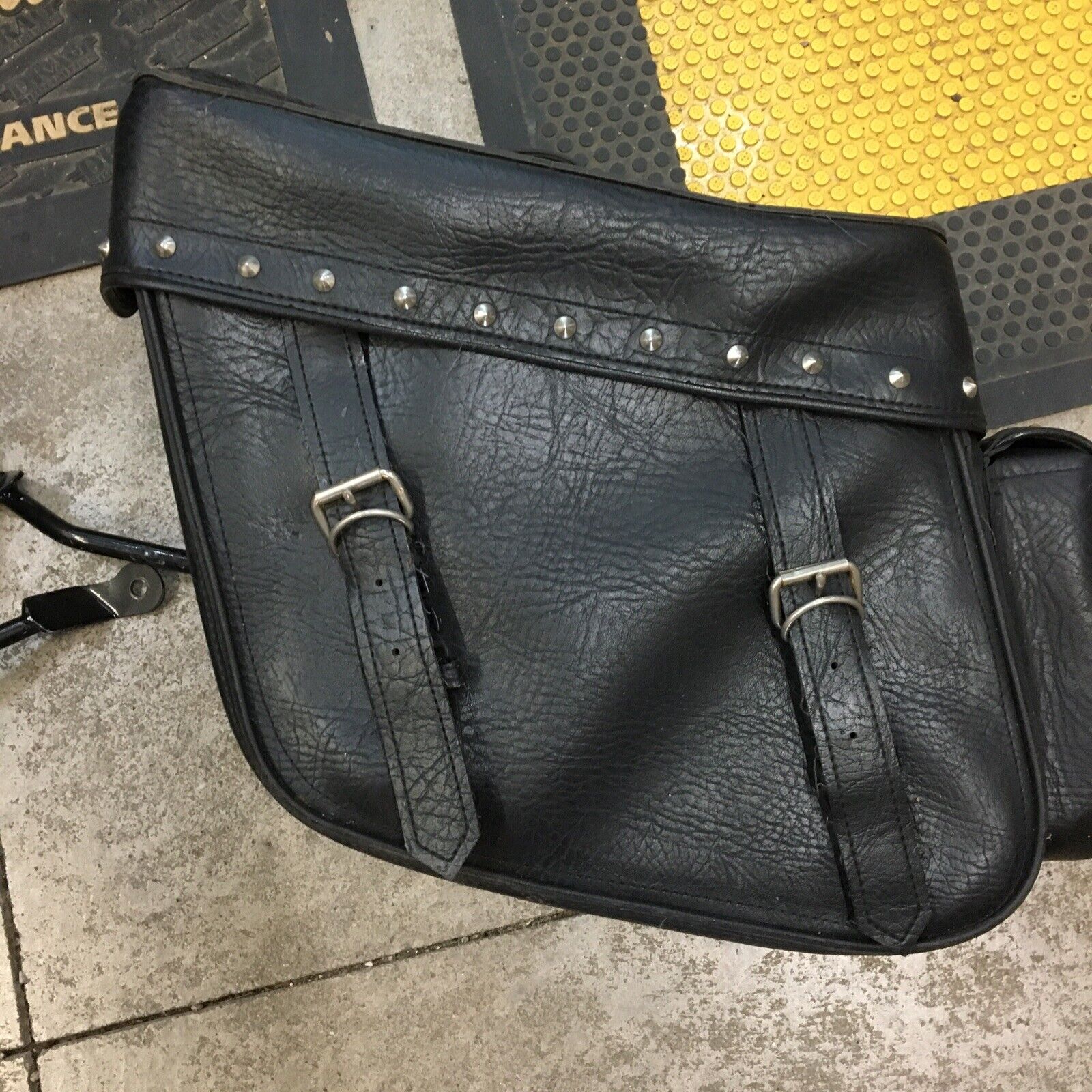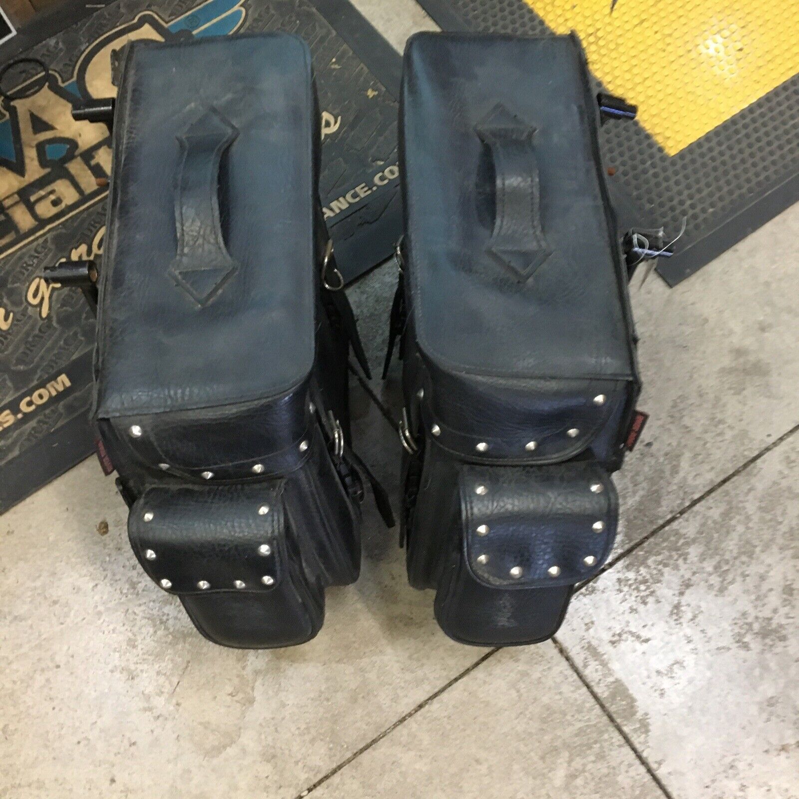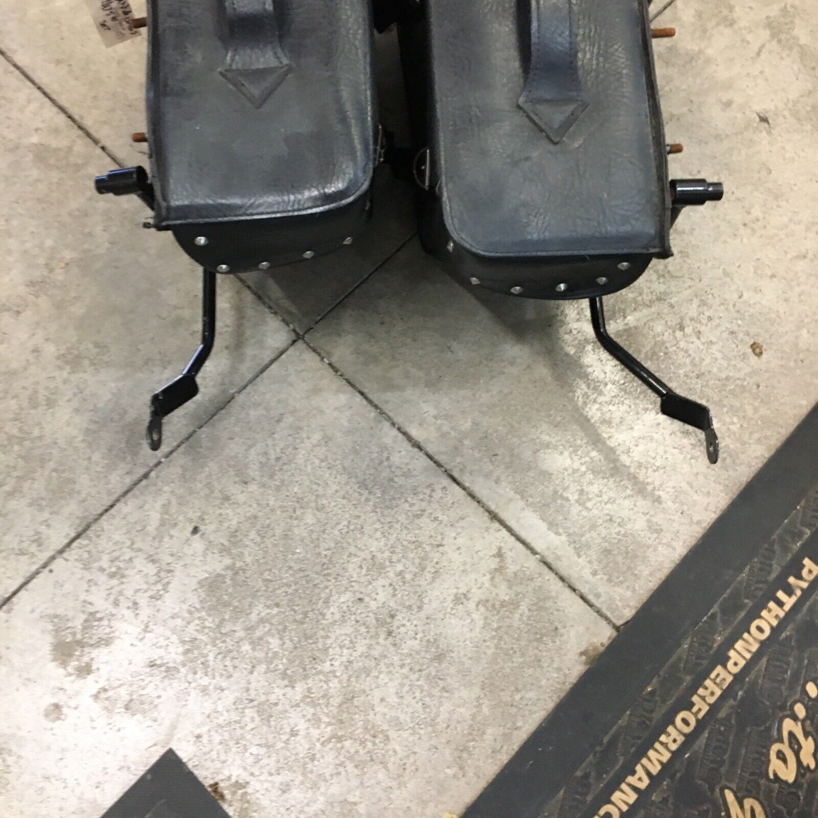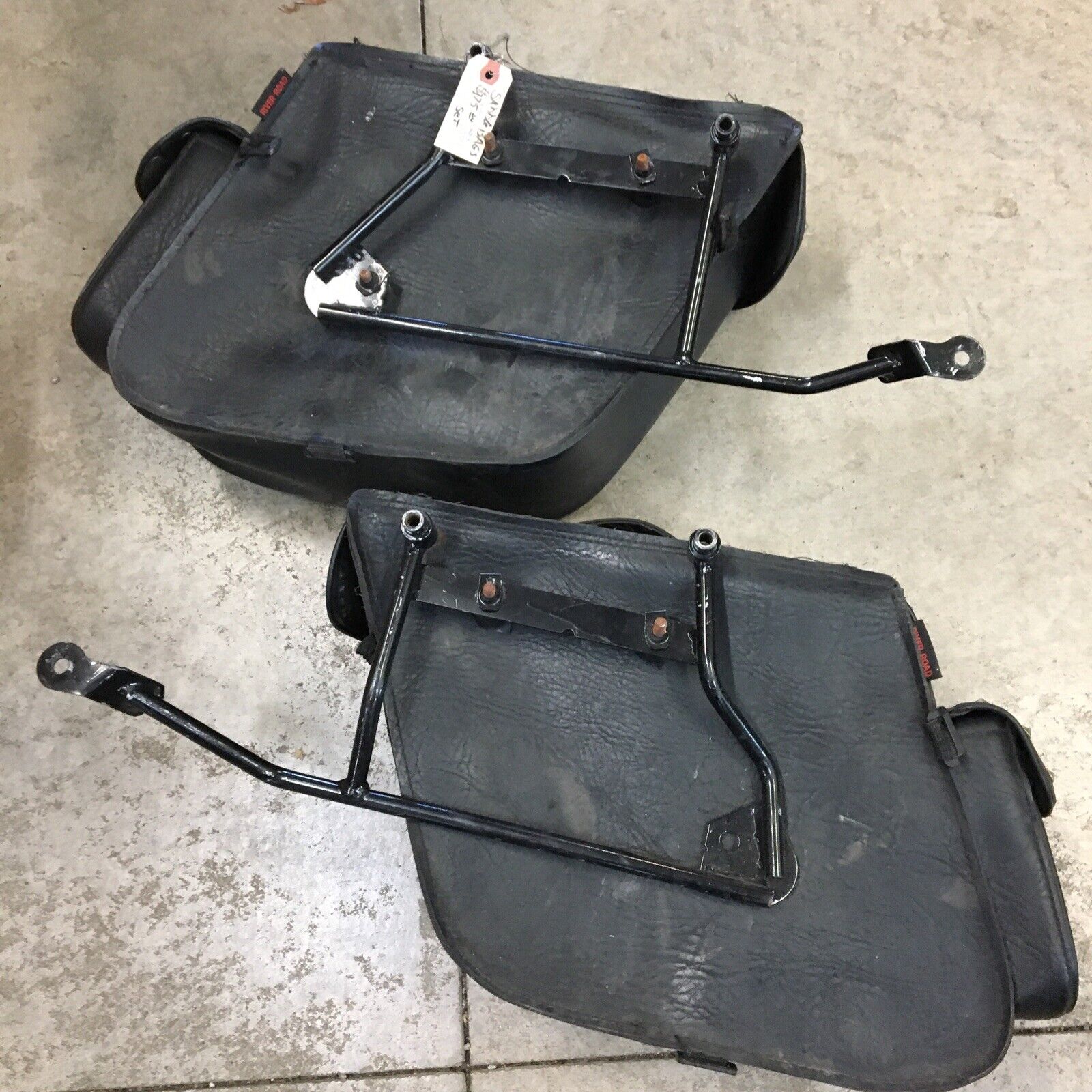 Condition is used as seen in pictures. Bags measure 21” length 12” height and 6-1/2” width. Brackets measure top mounting holes are 7-1/4” apart center to center, 9” center of top hole to lower bracket hole. Not sure what these fit please ask for more information if needed buyer is responsible for fitment and applications no returns
