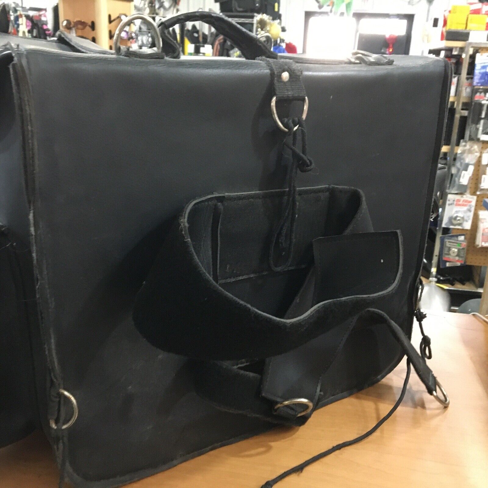 Condition is used. The strap on top is only held on by 2 rivets it has come loose. Has 2 side pouches and 1 front pouch also has rain cover. Measures 27” overall length, 16” height, width 9”. Buyer is responsible for fitment and applications no returns