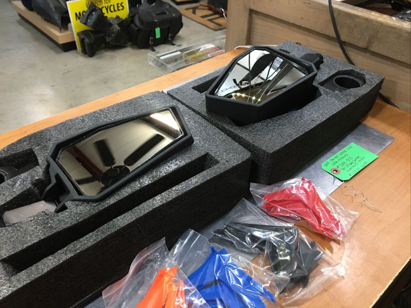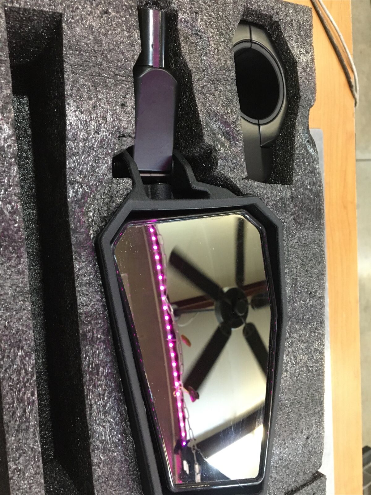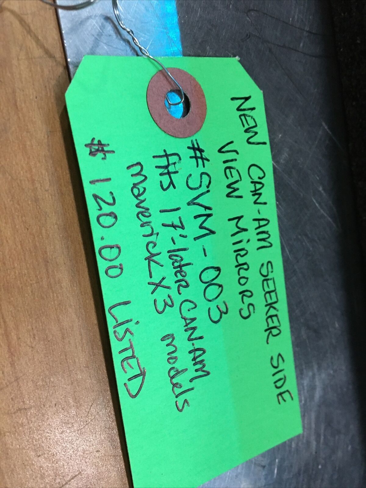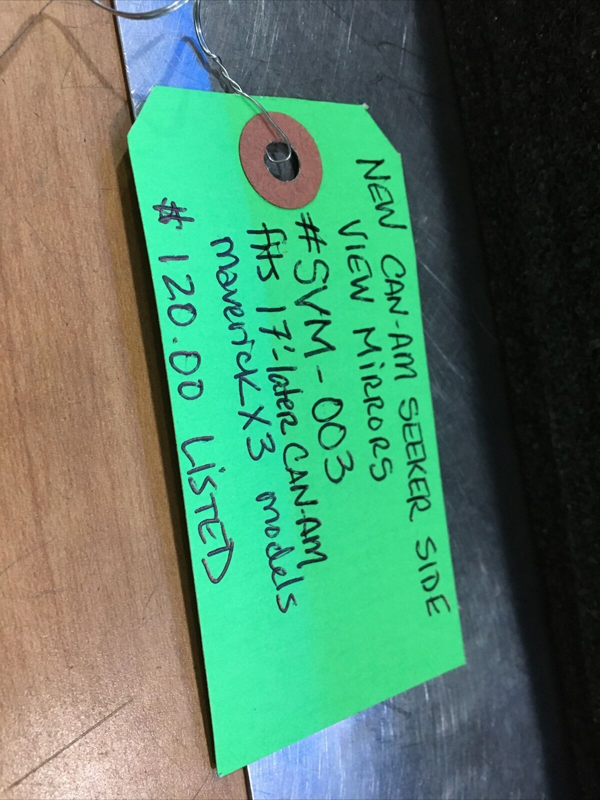 Can-Am Seeker Side View Mirrors #SVM-003. Condition is new. 6.5” x 4.1” convex mirrors, comes with snap-on chevrons in multiple colors and heavy duty billet aluminum clamps fits 1.75” cages and 17’-later Can-Am Maverick X3 models buyer is responsible for fitment and applications