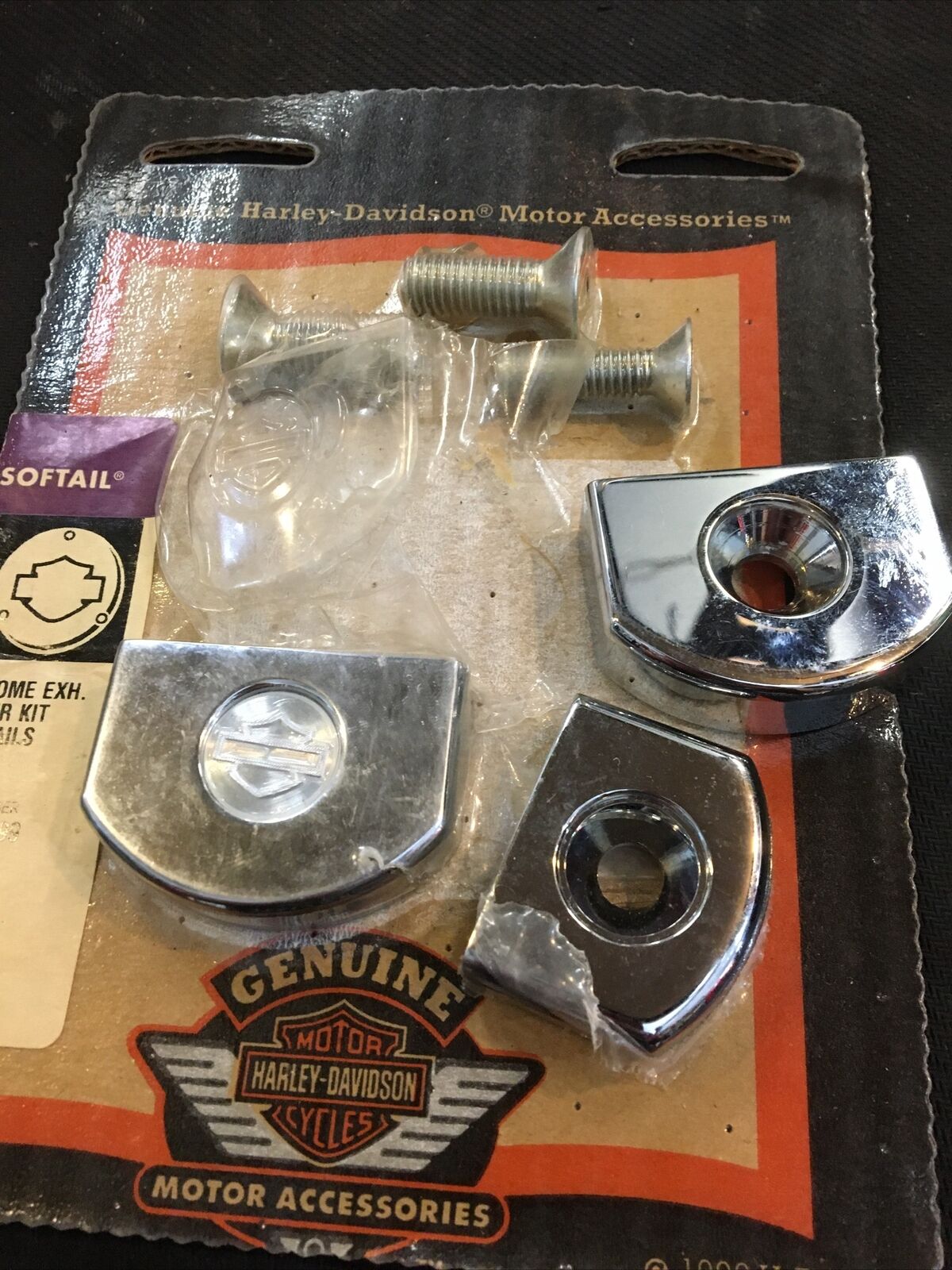 Harley Davidson Chrome Exhaust Muffler Tab Covers #65038-99.missing 2 of the bar and shield emblems. Obsolete item fits 95’-later Softails buyer is responsible for fitment and applications no returns