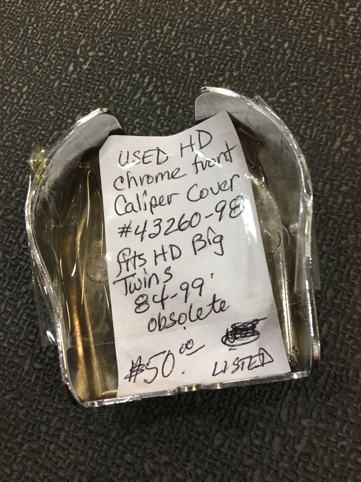 Harley Davidson chrome front caliper cover #43260-98. Obsolete item fits 84-99’ Big Twins with oem front brake caliper buyer is responsible for fitment and applications no returns