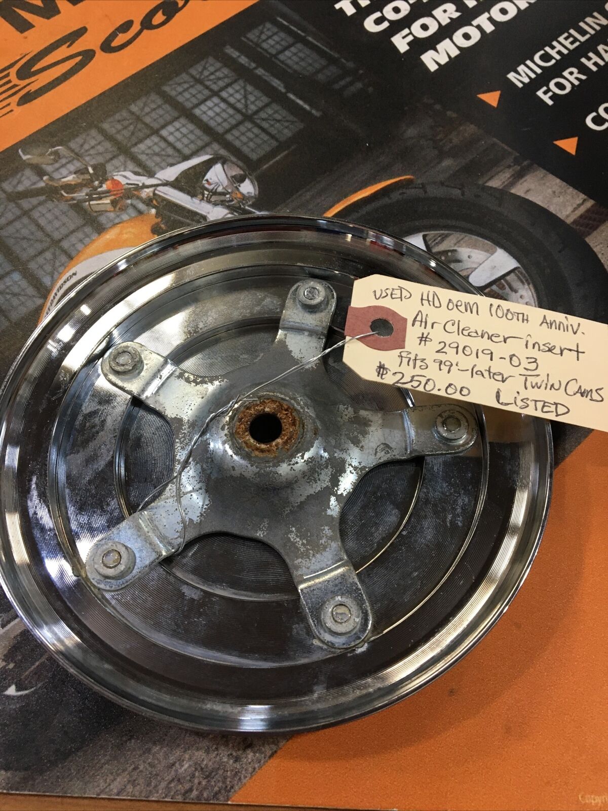 Harley Davidson oem 100th anniversary air cleaner insert #29019-03. Condition is used. Obsolete item.Fits 99’-later Twin Cam models buyer is responsible for fitment and applications