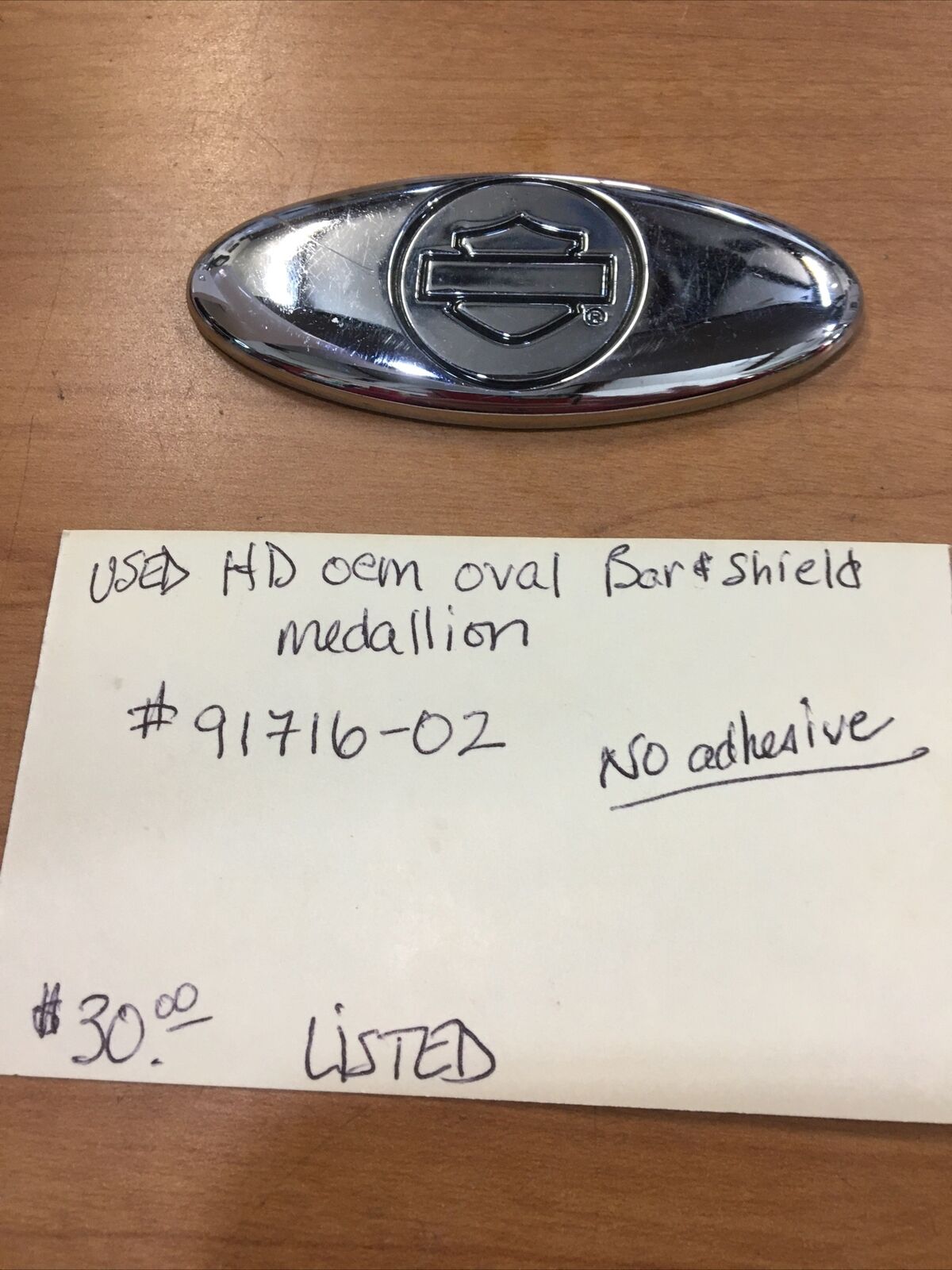 Tags: 91716-02, adhesive, Bar & Shield medallion, fitment, Harley Davidson, Harley Davidson parts, Motorcycle Accessories, OEM Oval Bar, United States, Used