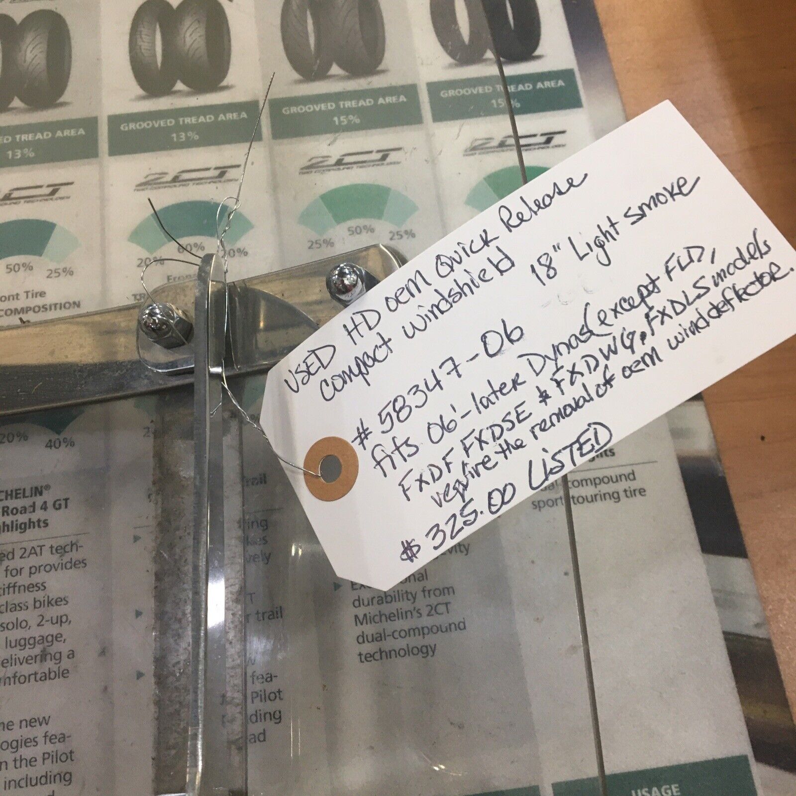 Harley Davidson oem quick release compact windshield #58347-06. 18” light smoke fits 06’-later Dynas except FLD, FXDF, FXDSE, FXDWG. FXDLS models require the removal of oem wind deflector buyer is responsible for fitment and applications