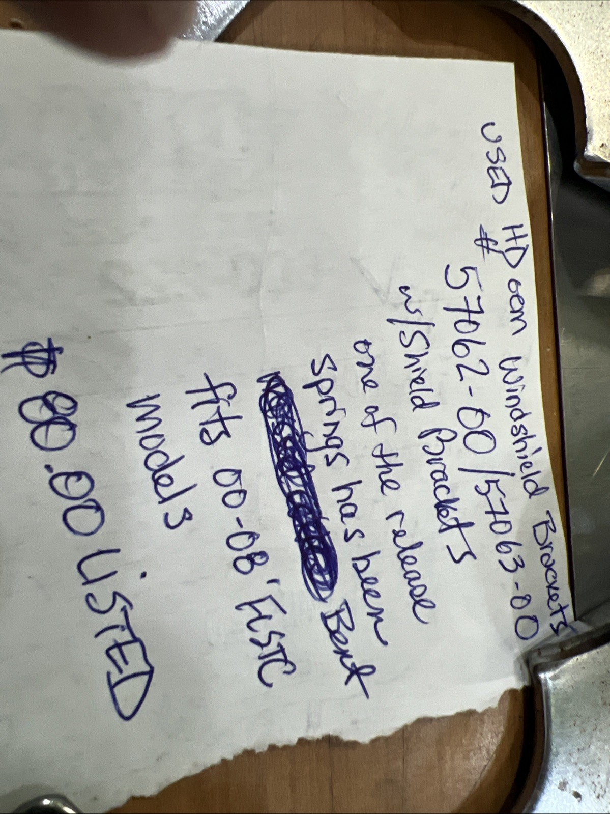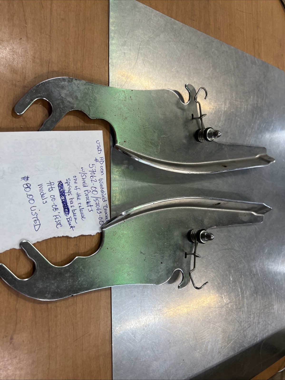 Harley Davidson oem Windshield Brackets #57062-00/57063-00. Condition is used. One of the brackets release spring has been bent.Fits 00-08’ FLSTC models buyer is responsible for fitment and applications