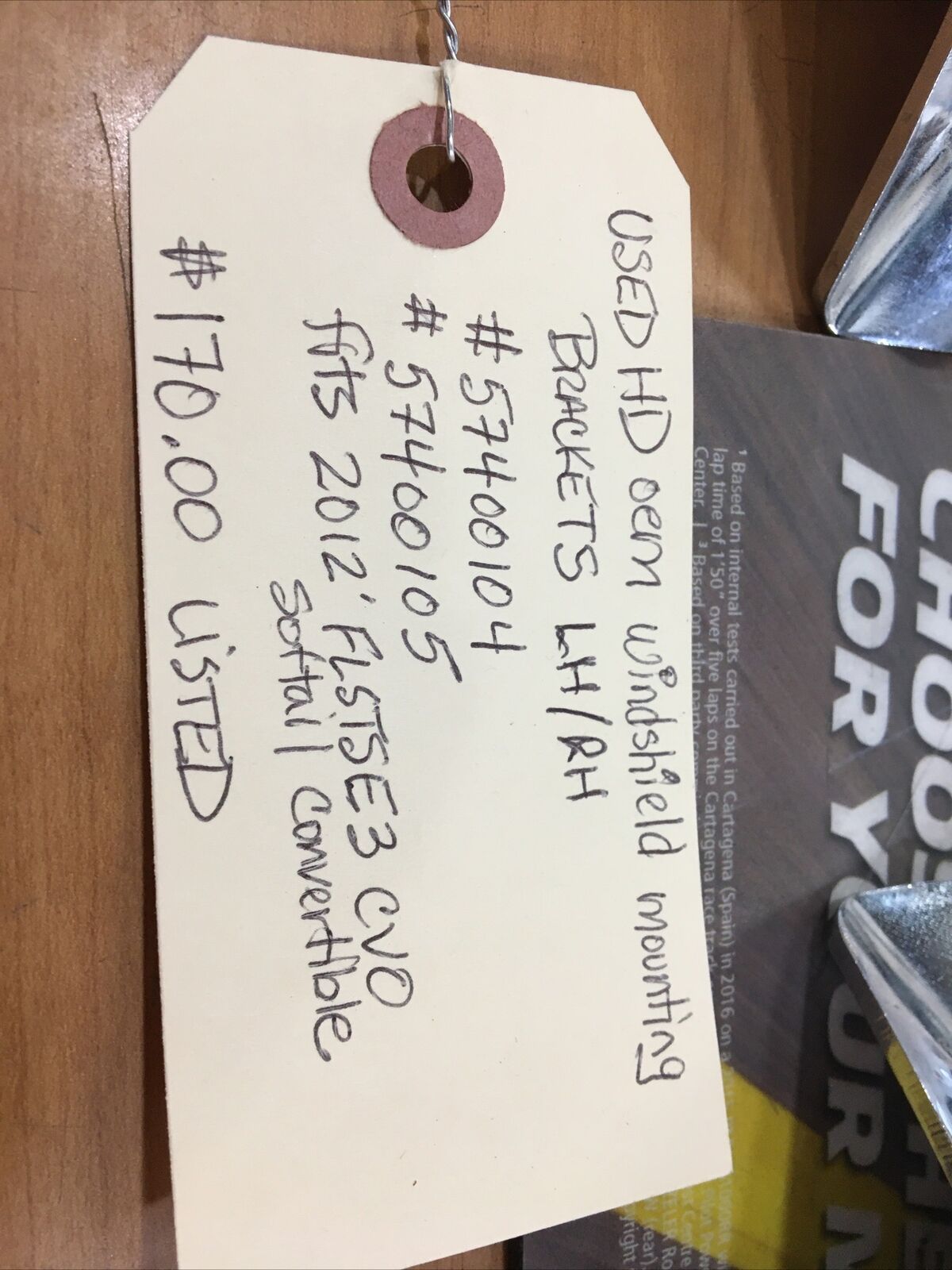 Harley Davidson oem Windshield mounting brackets LH/RH #57400104/57400105. Condition is used. Fits 2012’ FLSTSE3 CVO Softail Convertible buyer is responsible for fitment and applications
