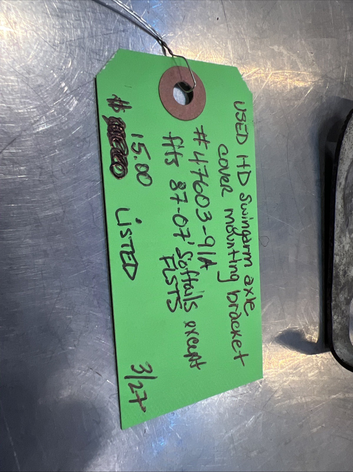 Harley Davidson Swingarm Axle Cover Mounting Bracket #47603-91A. Condition is used. Fits 87-07’ Softails except FLSTS models buyer is responsible for fitment and applications