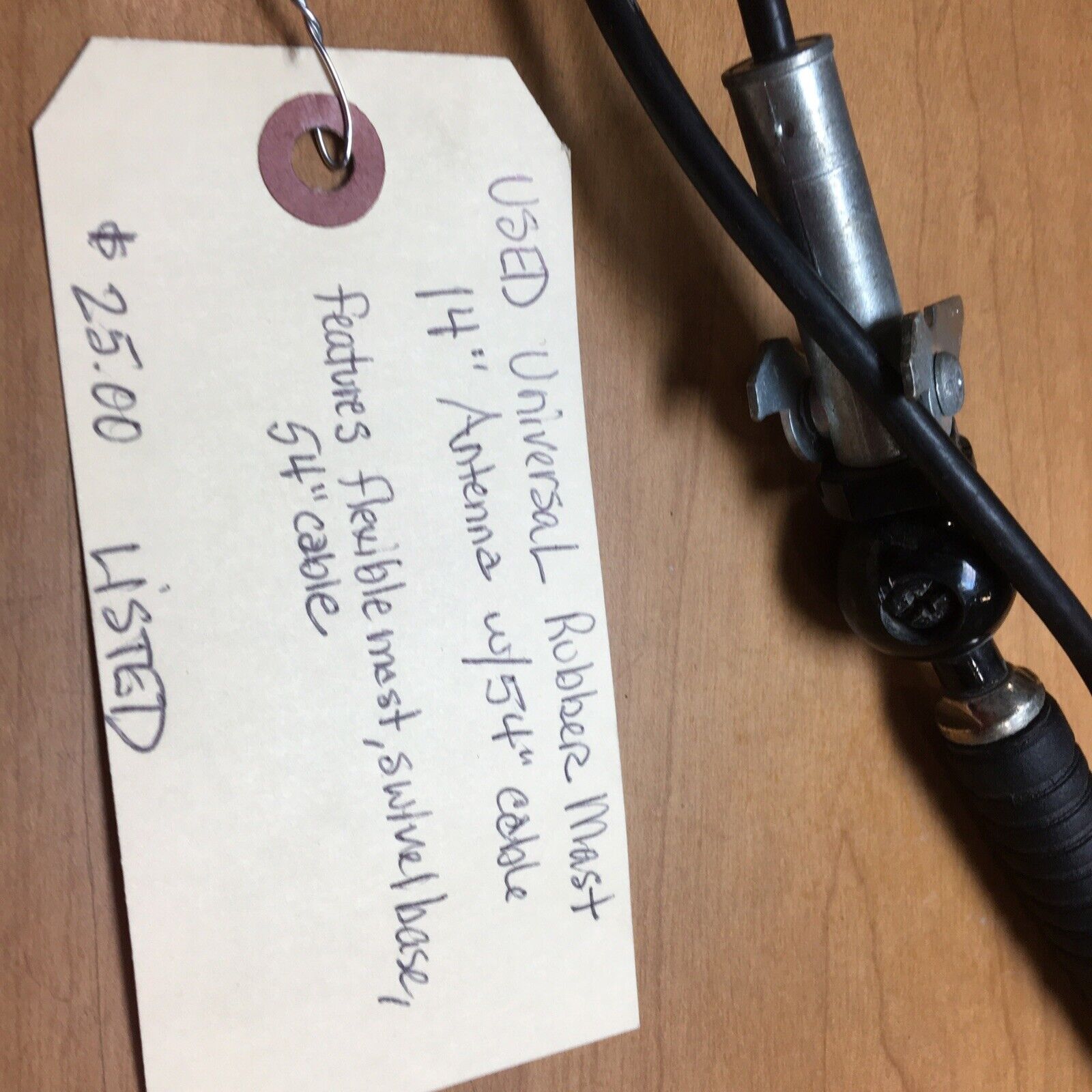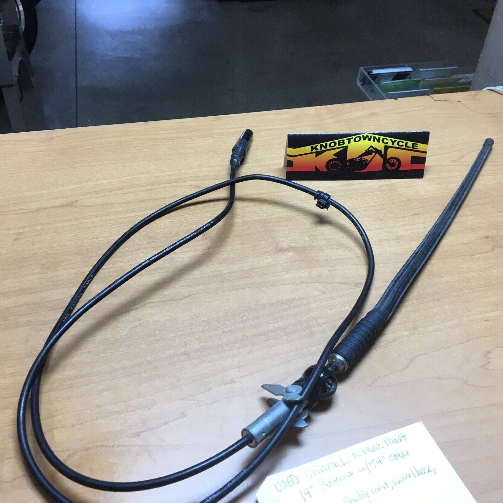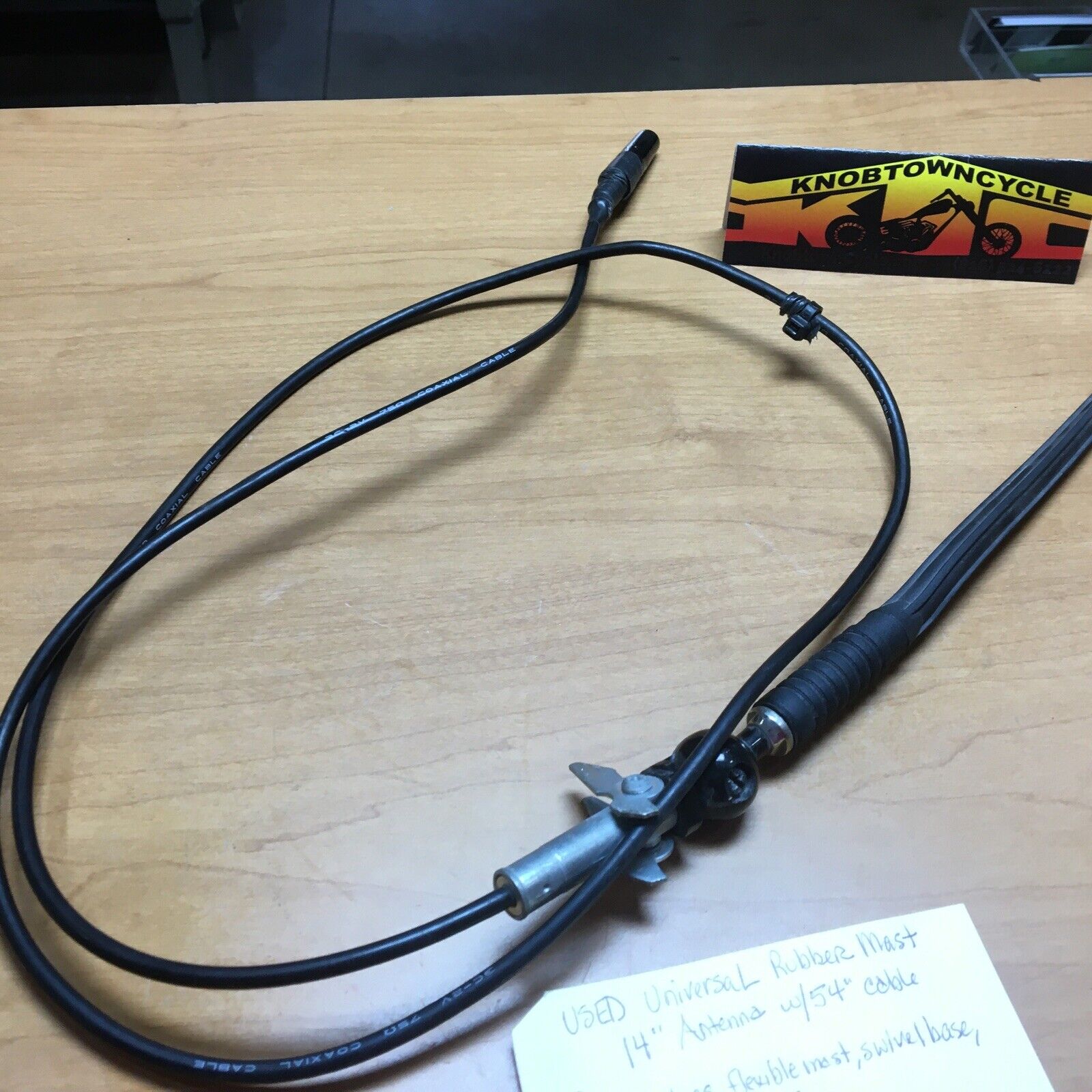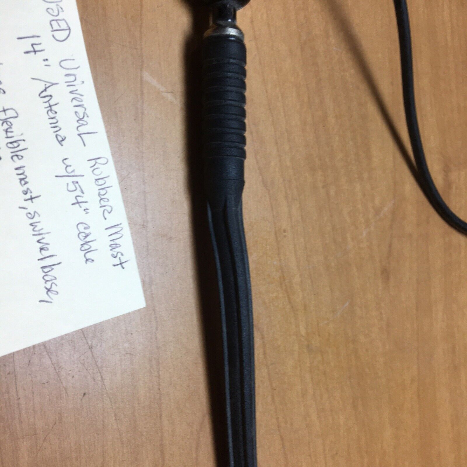 Universal Rubber Mast 14” Antenna w/54” cable. Condition is used. Features flexible mast, swivel base, 54” cable buyer is responsible for fitment and applications