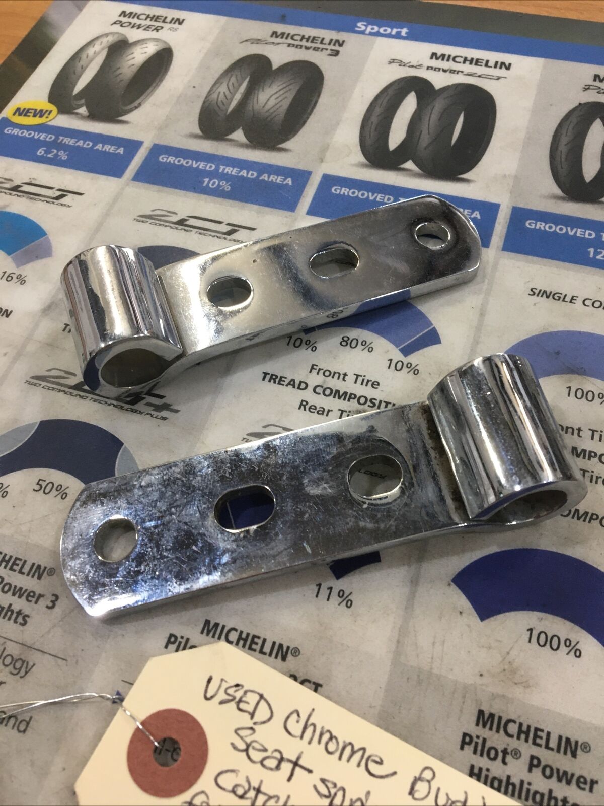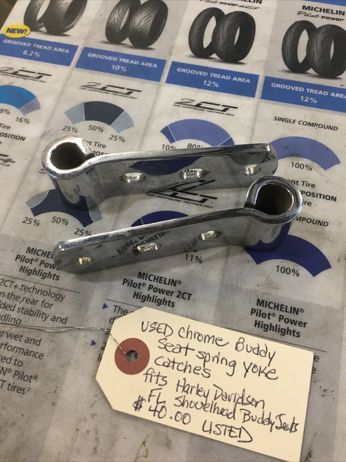 Chrome Buddy Seat Spring Yoke Catches. Condition is used. Fits Harley Davidson FL Shovelheads that have Buddy Seat buyer is responsible for fitment and applications