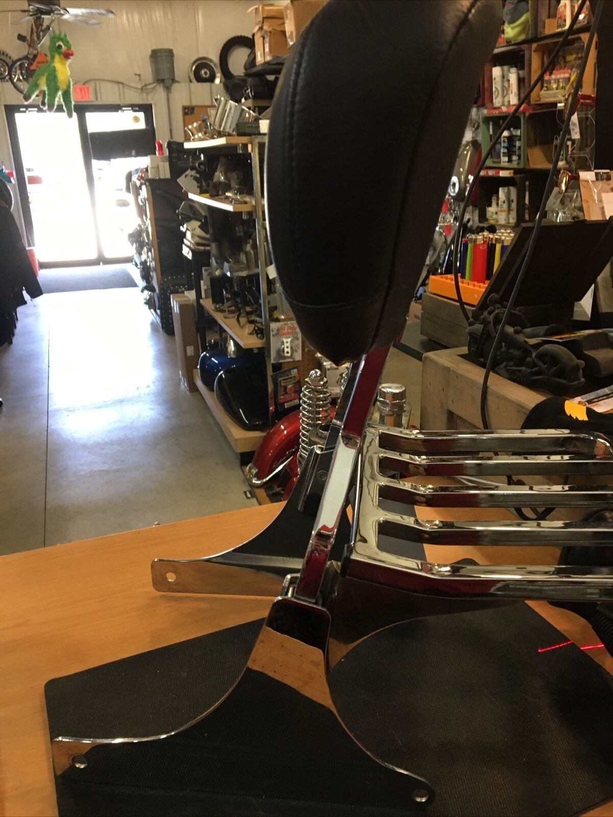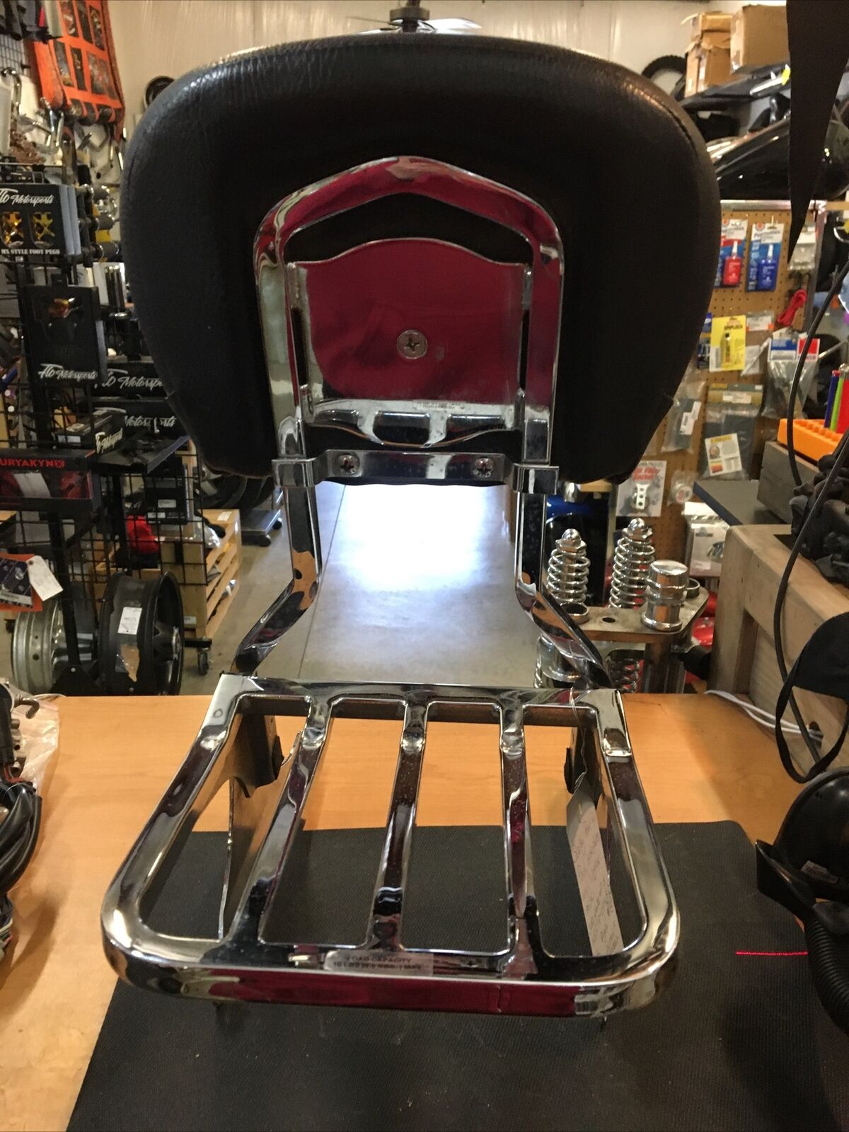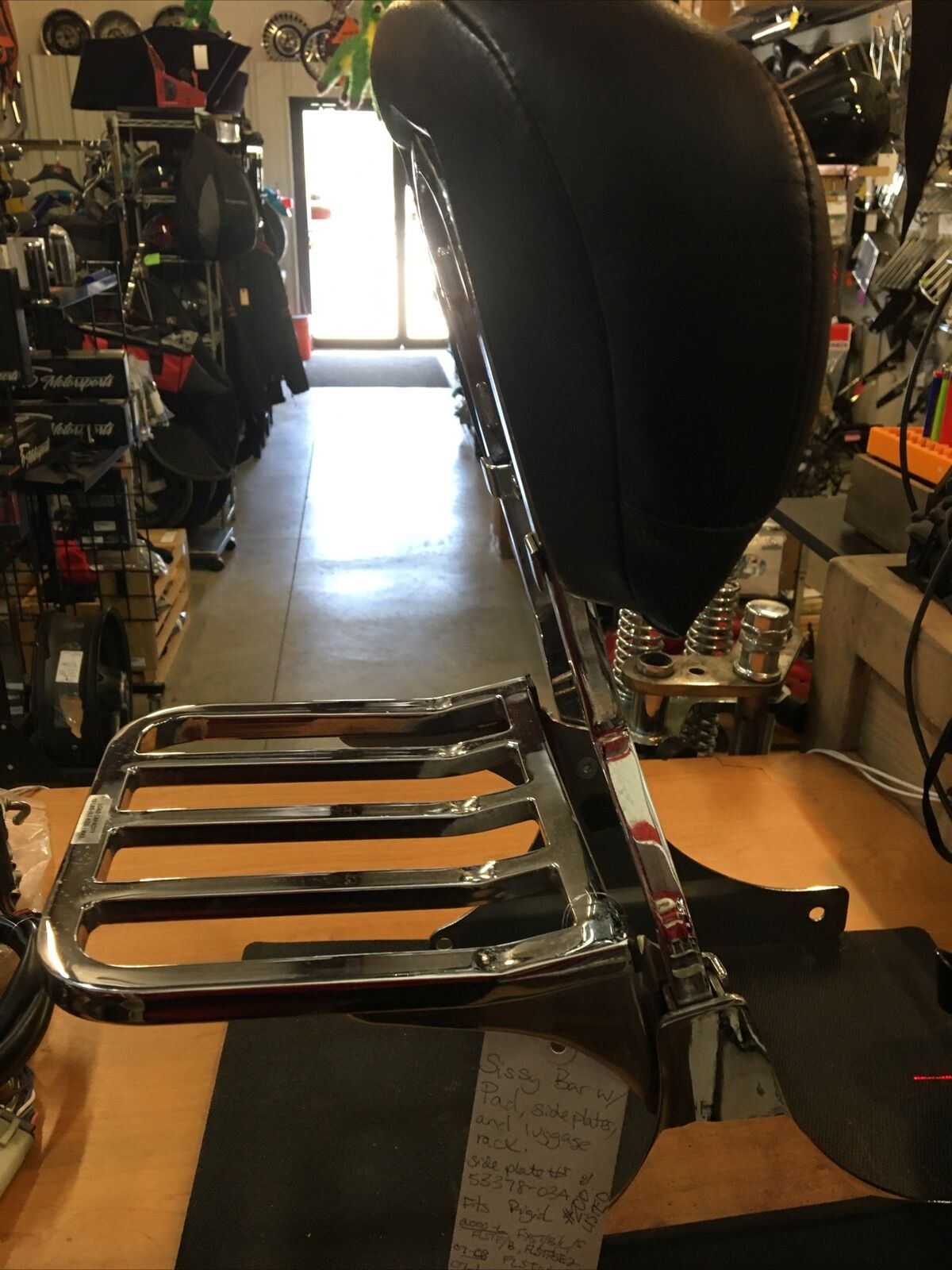 Chrome Rigid Mounted Sissy Bar/Pad With Luggage Rack #53378-03A. Condition is “Used”.there is a little tear in vinyl backrest pad at the top as seen in picture.fits 00’-later FXST,B/C/S, FLSTF,B, FLSTFSE2 and 07-08’ FLSTN and 07’-later FXSTC buyer is responsible for fitment and applications no returns