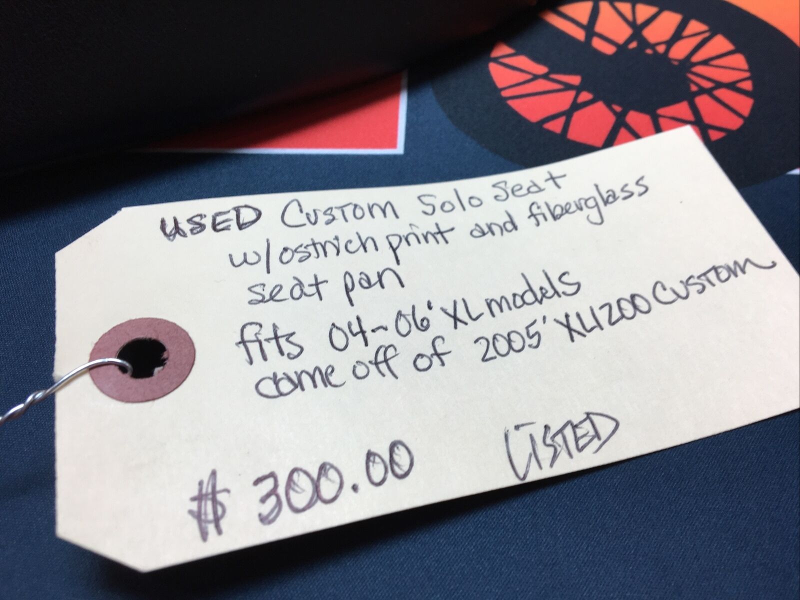 Custom Solo Seat w/Ostrich print and fibergass seat pan. Condition is used. Super lightweight. Fits 04-06’ XL models came off of 2005’ XL1200 Custom. Buyer is responsible for fitment and applications