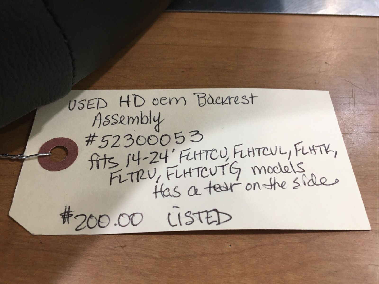 Harley Davidson oem Backrest Assembly #52300053. Condition is used. Has a tear in it on the side seen in pictures. Fits 14-24’ FLHTCU, FLHTCUL, FLHTK, FLTRU, FLHTCUTG models buyer is responsible for fitment and applications
