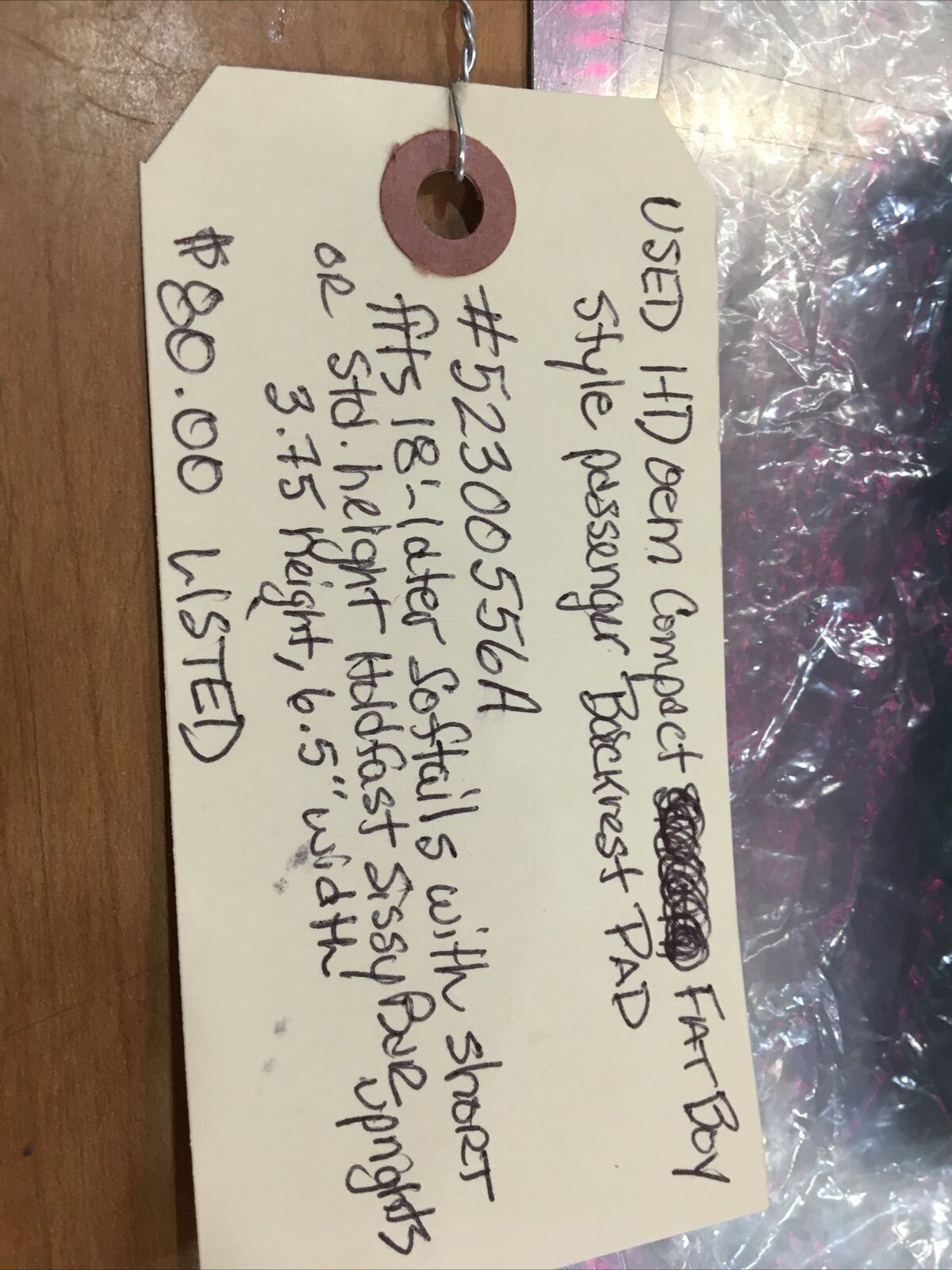 Harley Davidson oem Compact Fat Boy Style Passenger Backrest Pad #52300556A. Condition is used. Fits 18’-later Softails with short or std. height Holdfast Sissybar uprights. Measures 3.75” height, 6.5” width buyer is responsible for fitment and applications