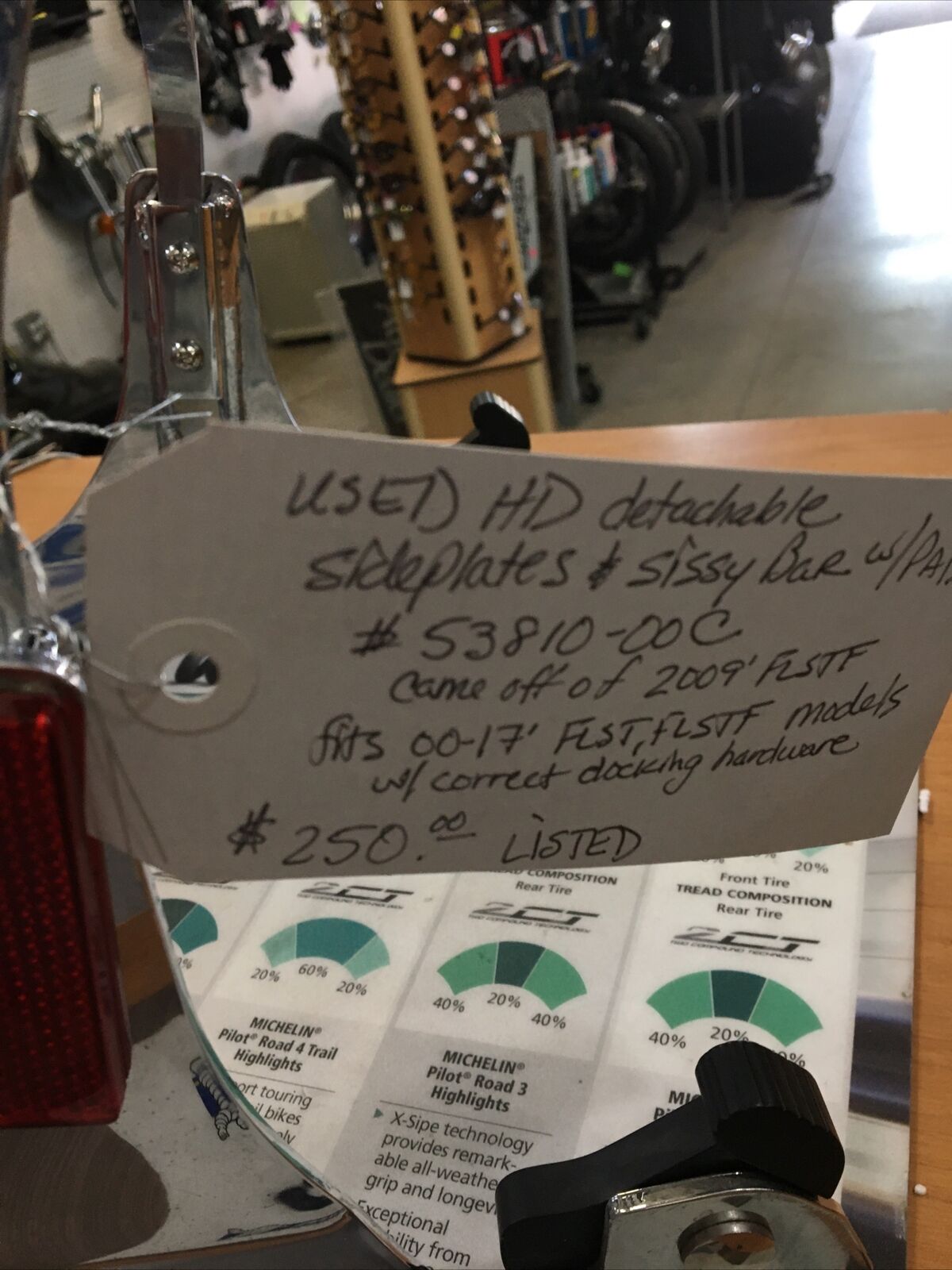 Harley Davidson oem detachable sideplates and sissybar with pad #53810-00C. Condition is used. Fits 00-17’ FLST models with correct docking hardware sold separately from your local Harley Davidson dealer. Buyer is responsible for fitment and applications