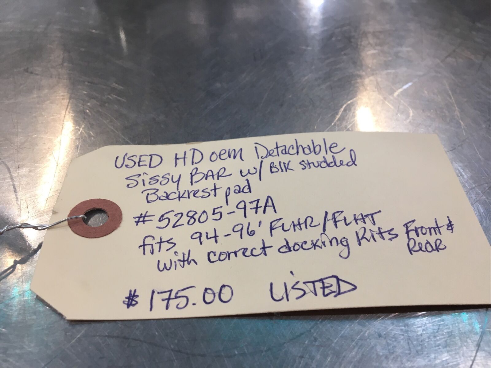 Harley Davidson oem Detachable Sissybar w/Blk studded backrest pad #52805-97A. Condition is used. Fits 94-96’ FLHR, FLHT models equipped with correct docking kits buyer is responsible for fitment and applications