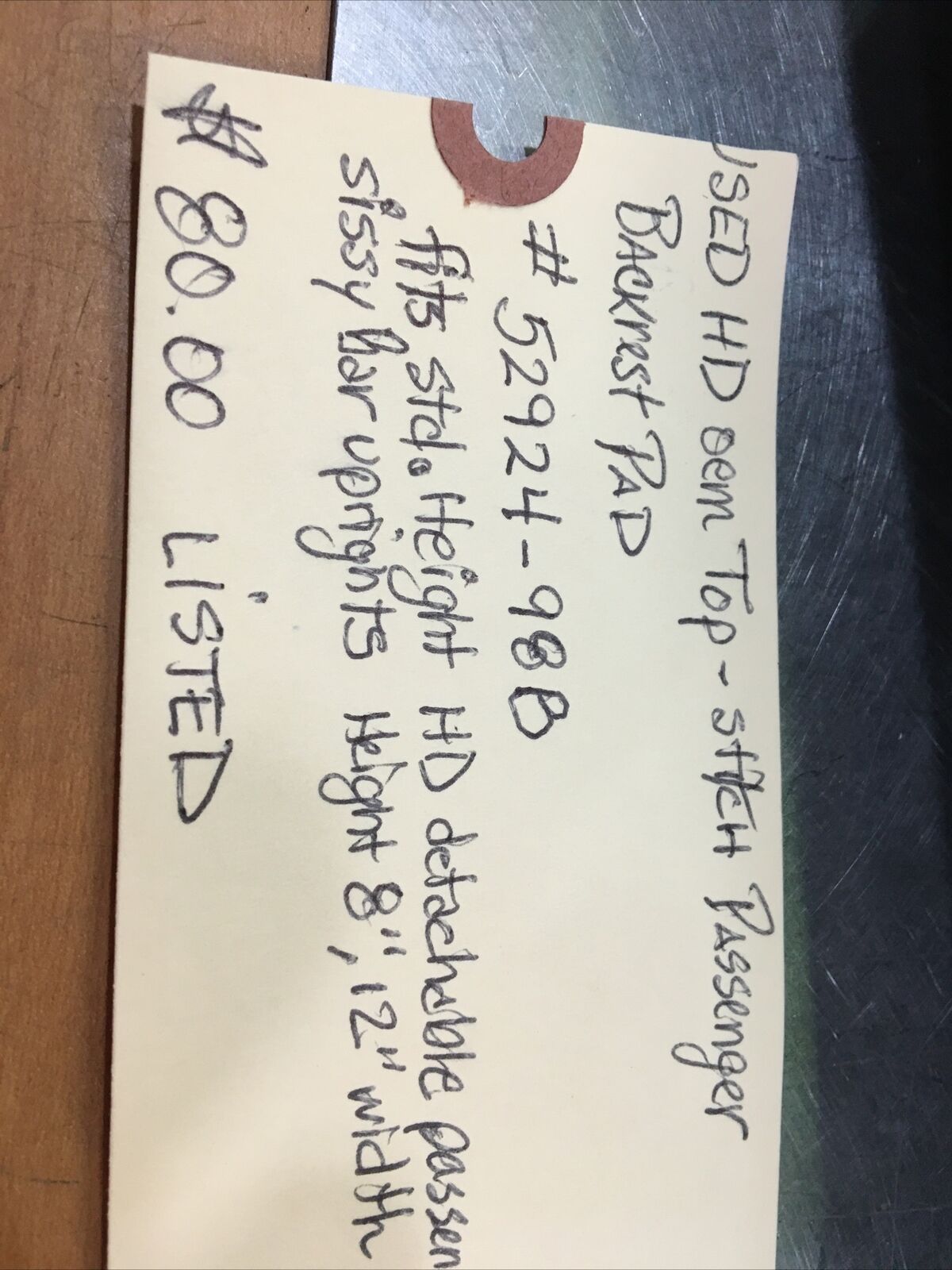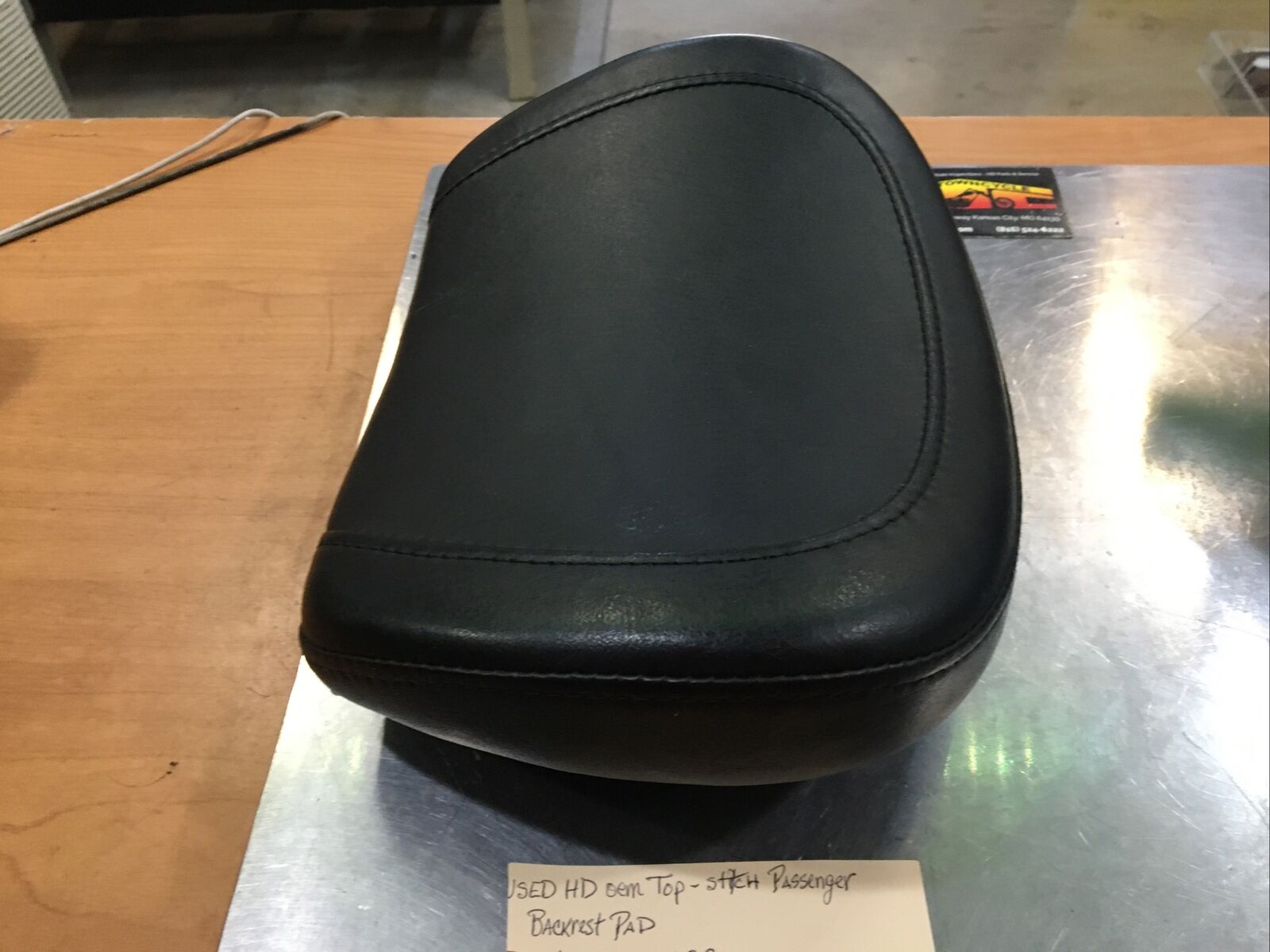 Harley Davidson oem Top-Stitch Passenger Backrest Pad #52924-98B. Condition is used. Fits Std. Height HD detachable passenger sissy bar uprights. Height 8”, 12” width buyer is responsible for fitment and applications
