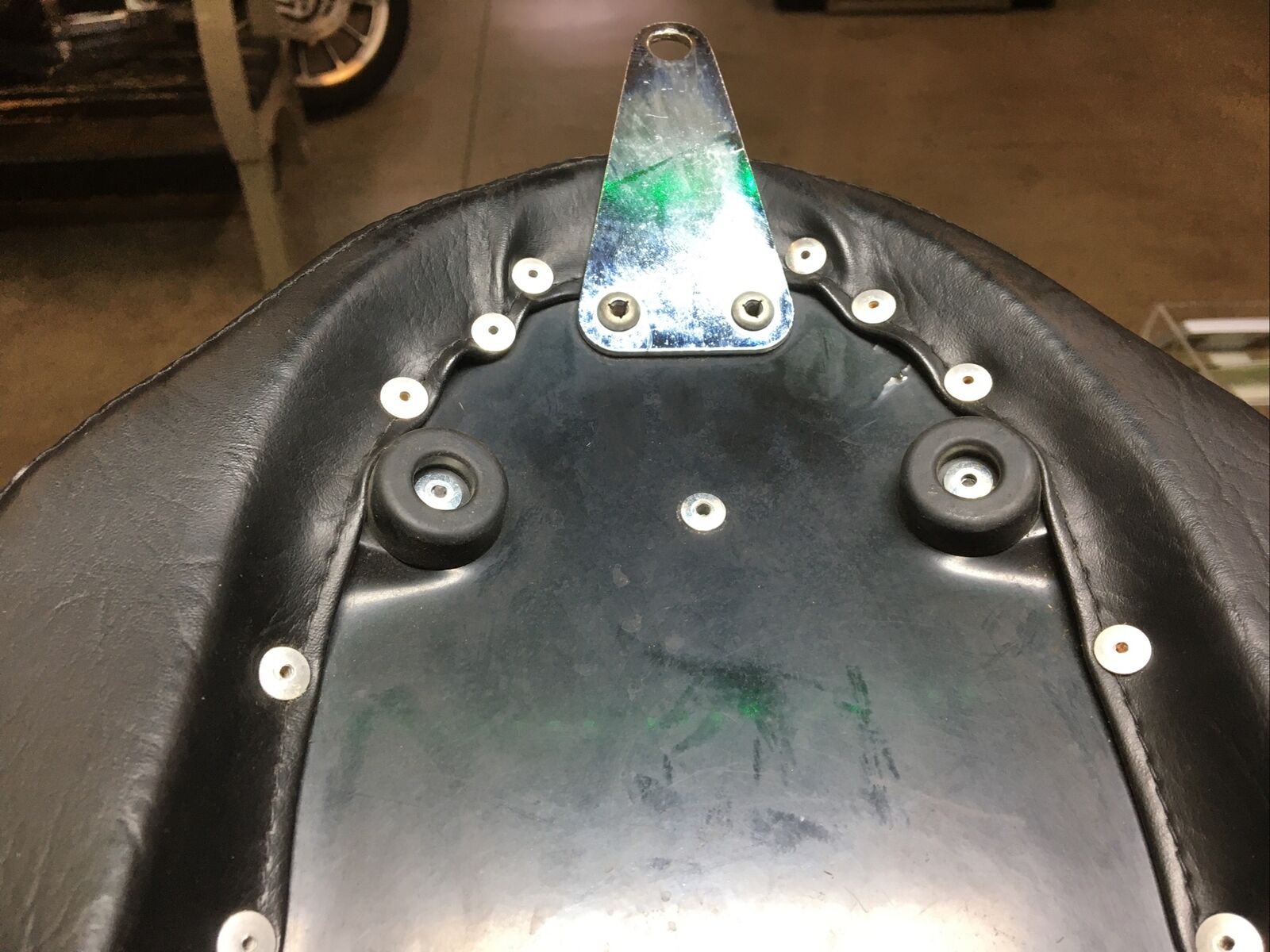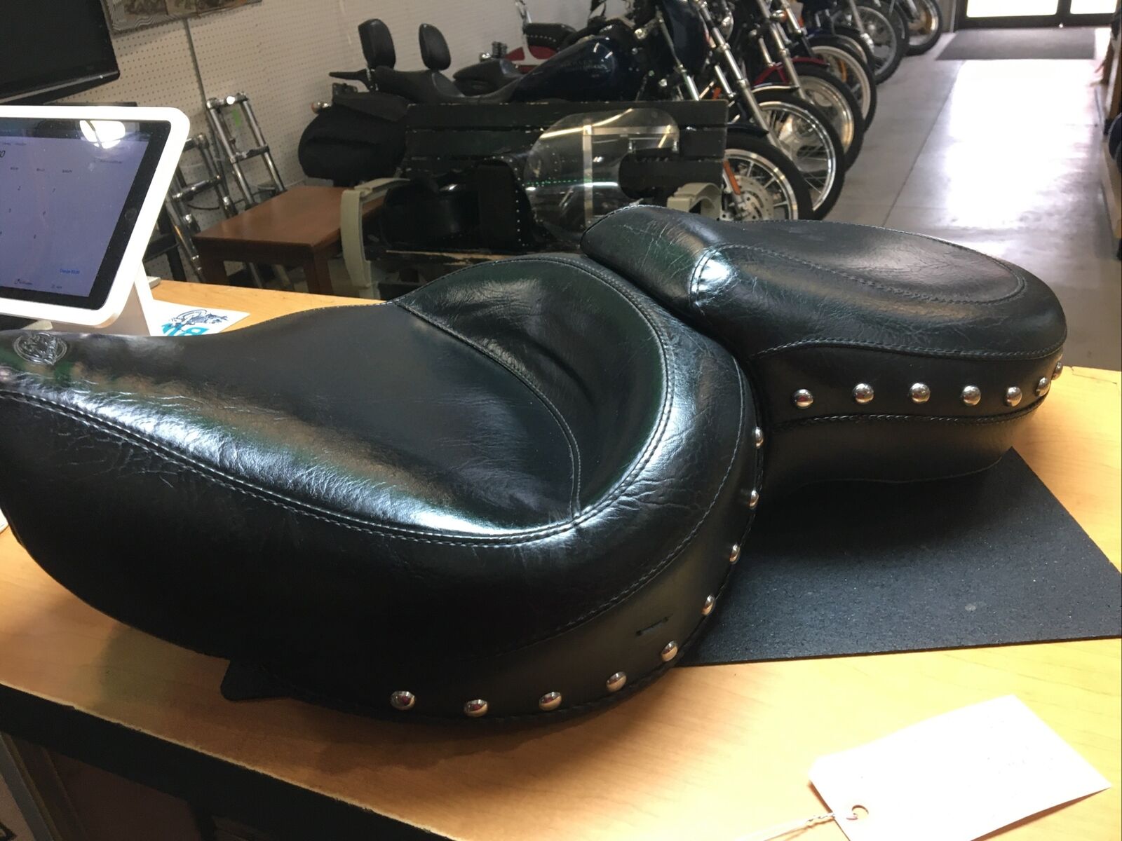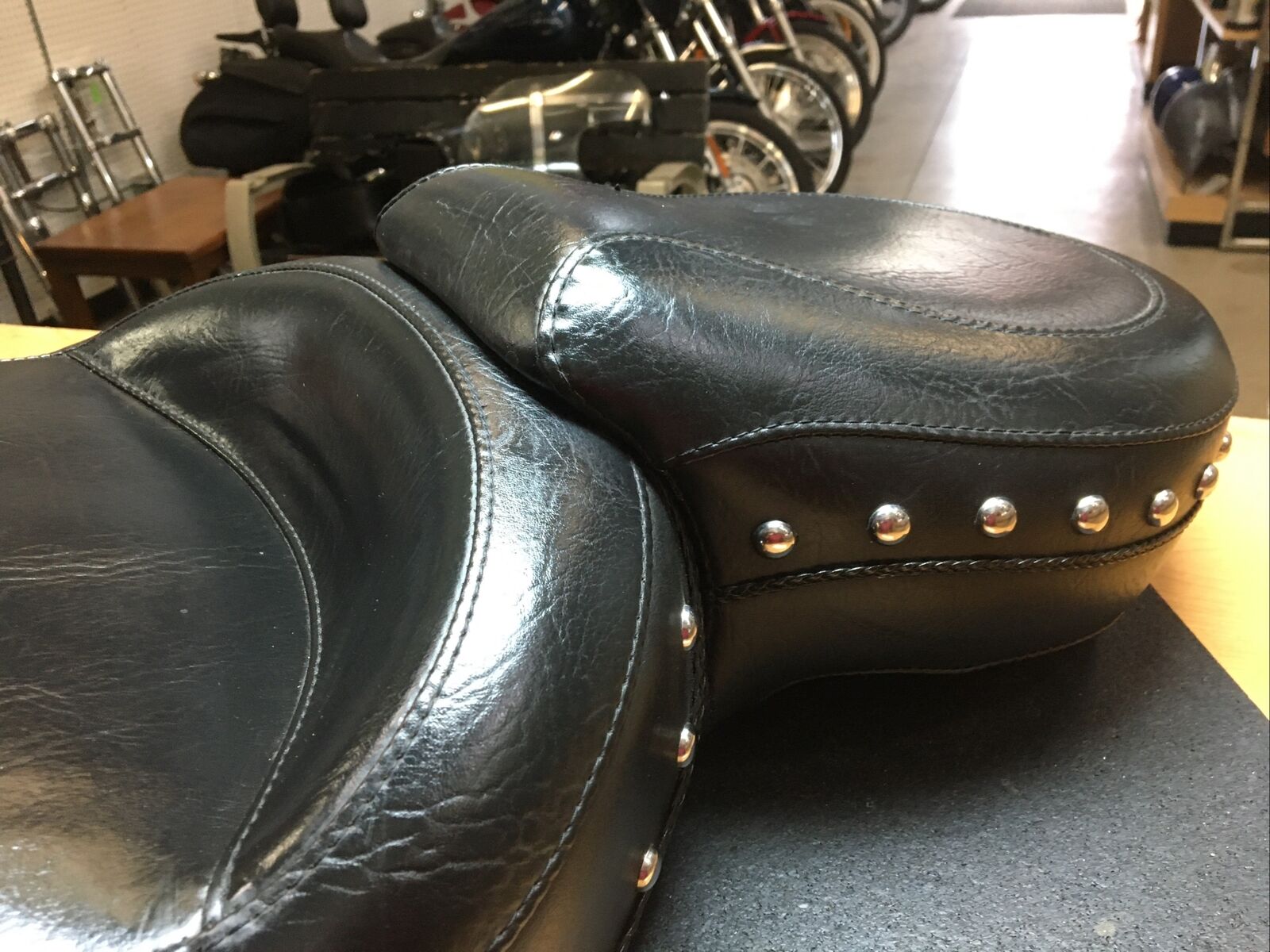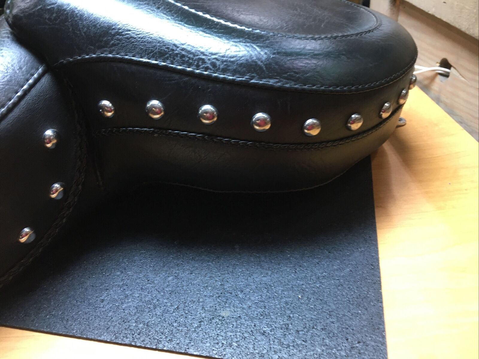 The seat features a wide touring design that provides ample space for both the rider and passenger, ensuring a comfortable and enjoyable ride. The chrome studs add a touch of elegance and style to the seat, making it stand out from the crowd. Despite being a used item, the seat is in good condition with only a few minor spots and a missing conch on the side, as shown in the pictures.
