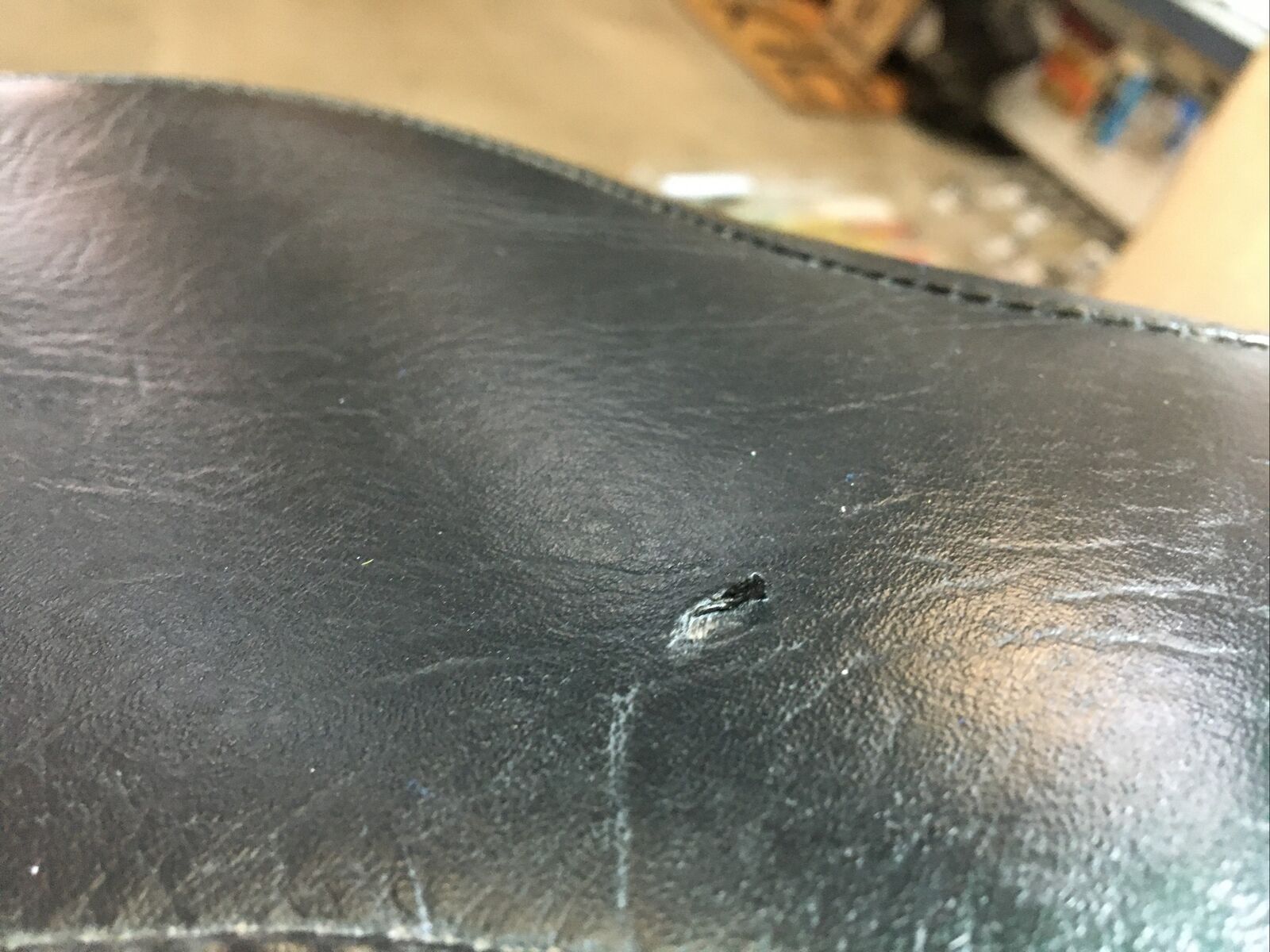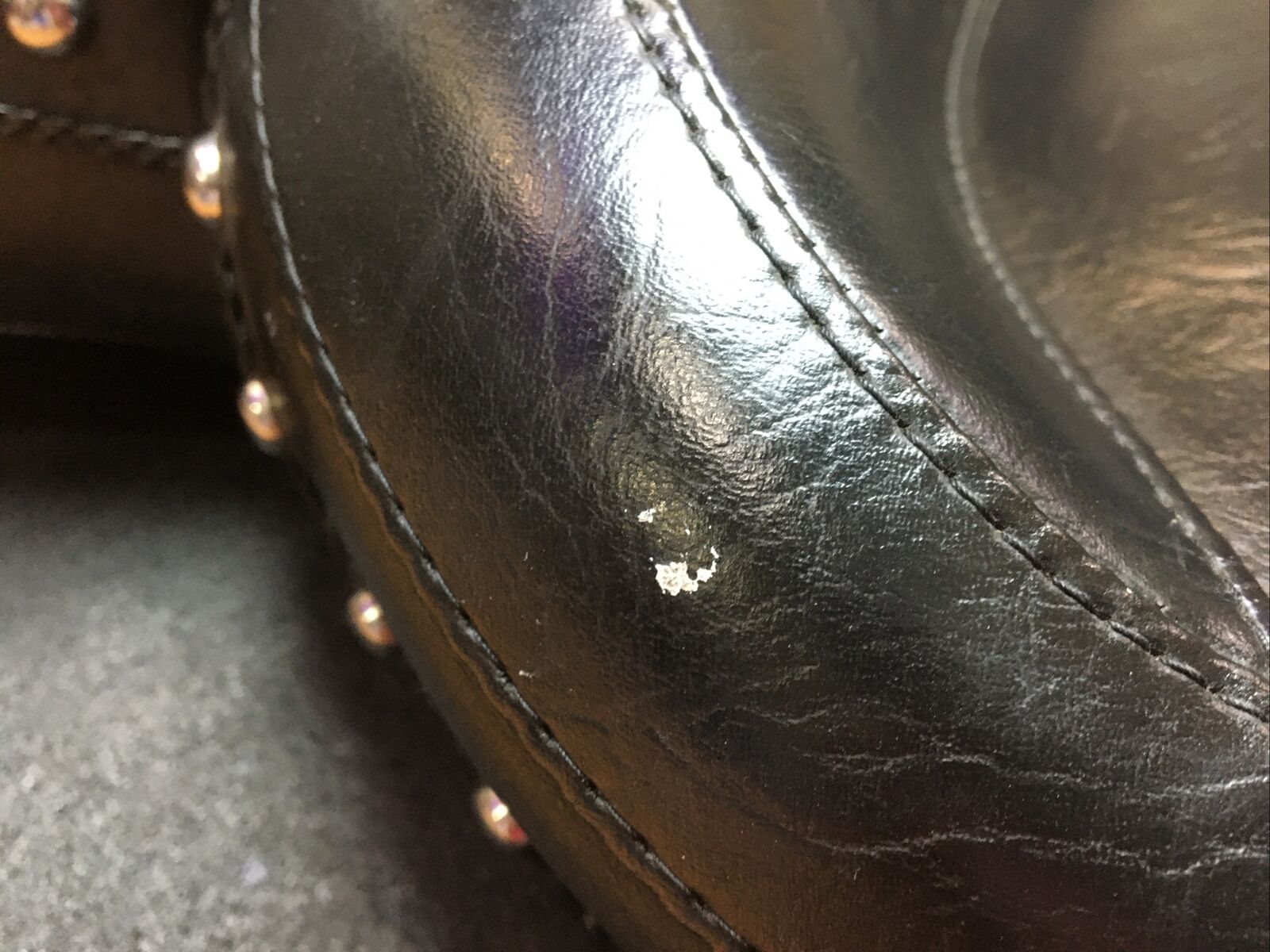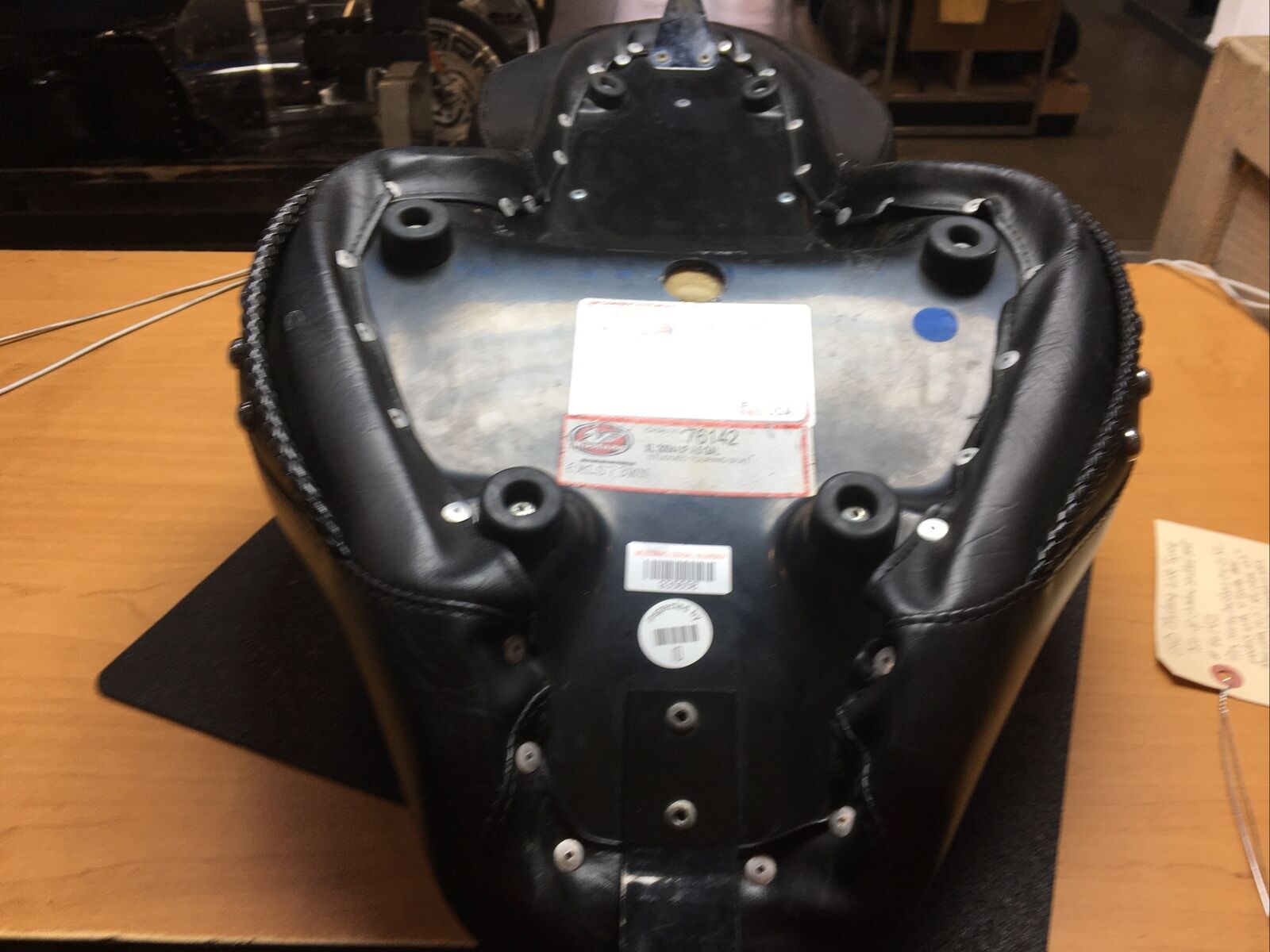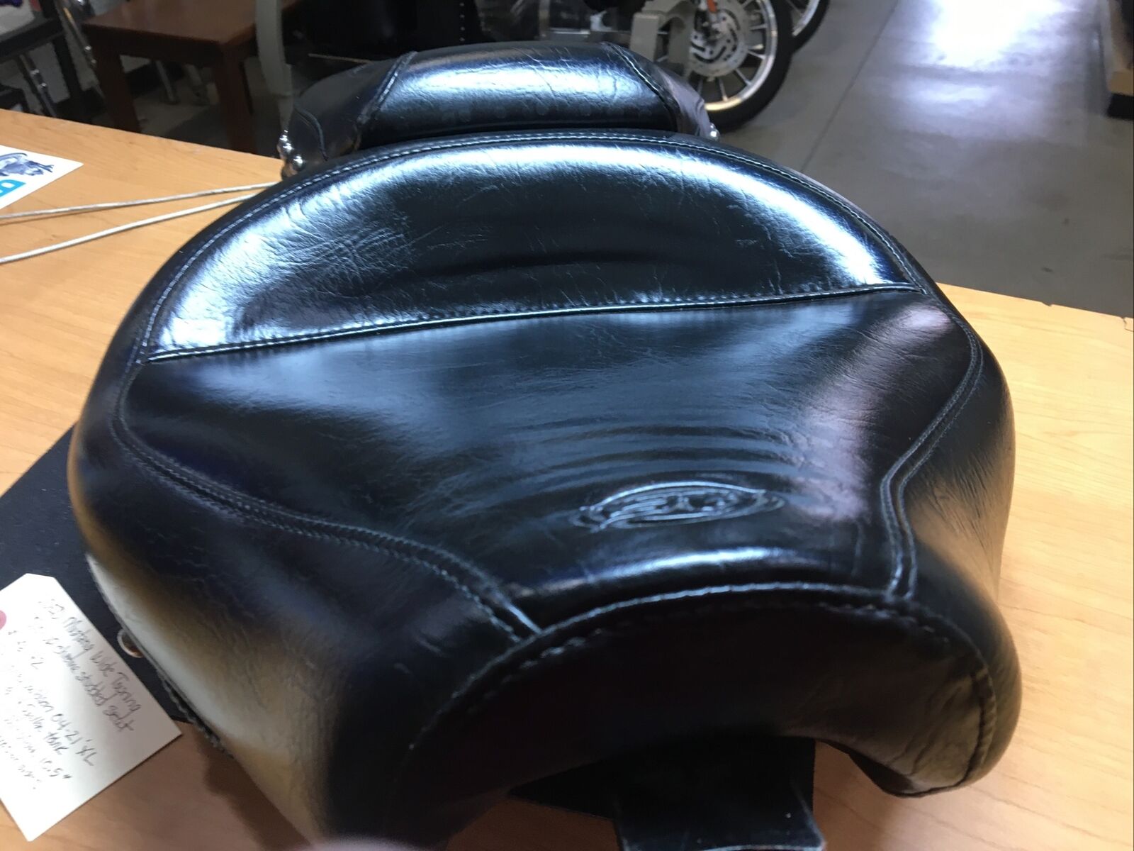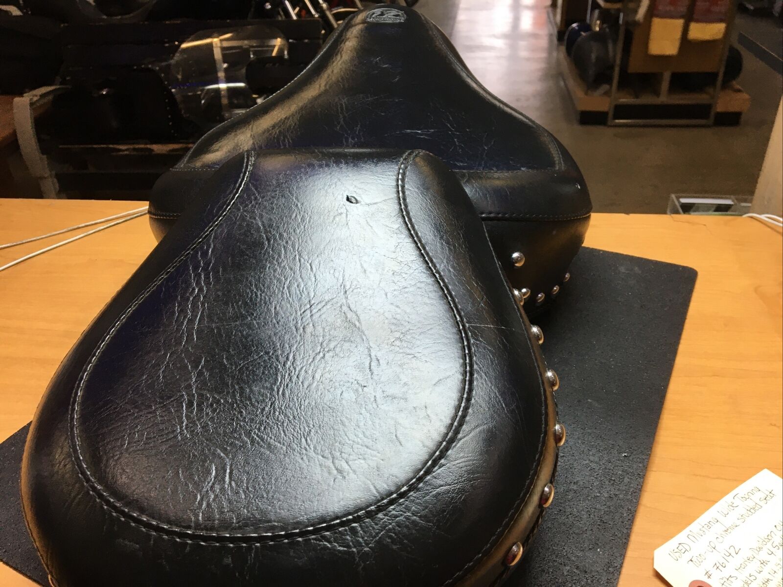 The seat features a wide touring design that provides ample space for both the rider and passenger, ensuring a comfortable and enjoyable ride. The chrome studs add a touch of elegance and style to the seat, making it stand out from the crowd. Despite being a used item, the seat is in good condition with only a few minor spots and a missing conch on the side, as shown in the pictures.