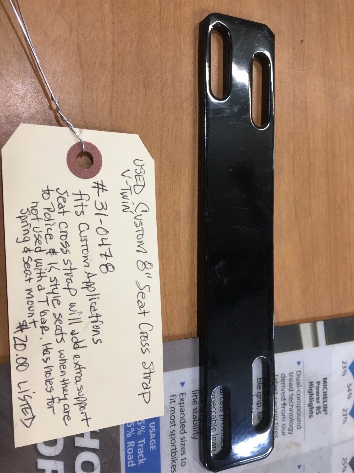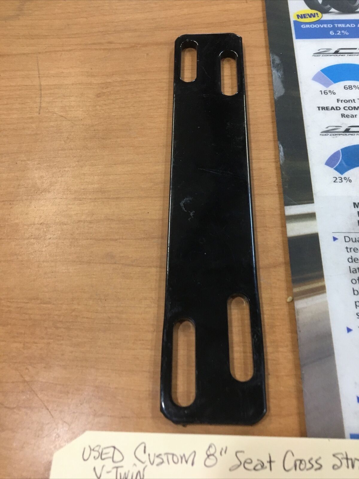 V-Twin Custom 8” Seat Cross Strap #31-0478. Condition is used. Fits Custom Applications. Seat cross strap will add extra support to police and k style seats when they are not used with a t bar. Has holes for spring and seat mount buyer is responsible for fitment and applications