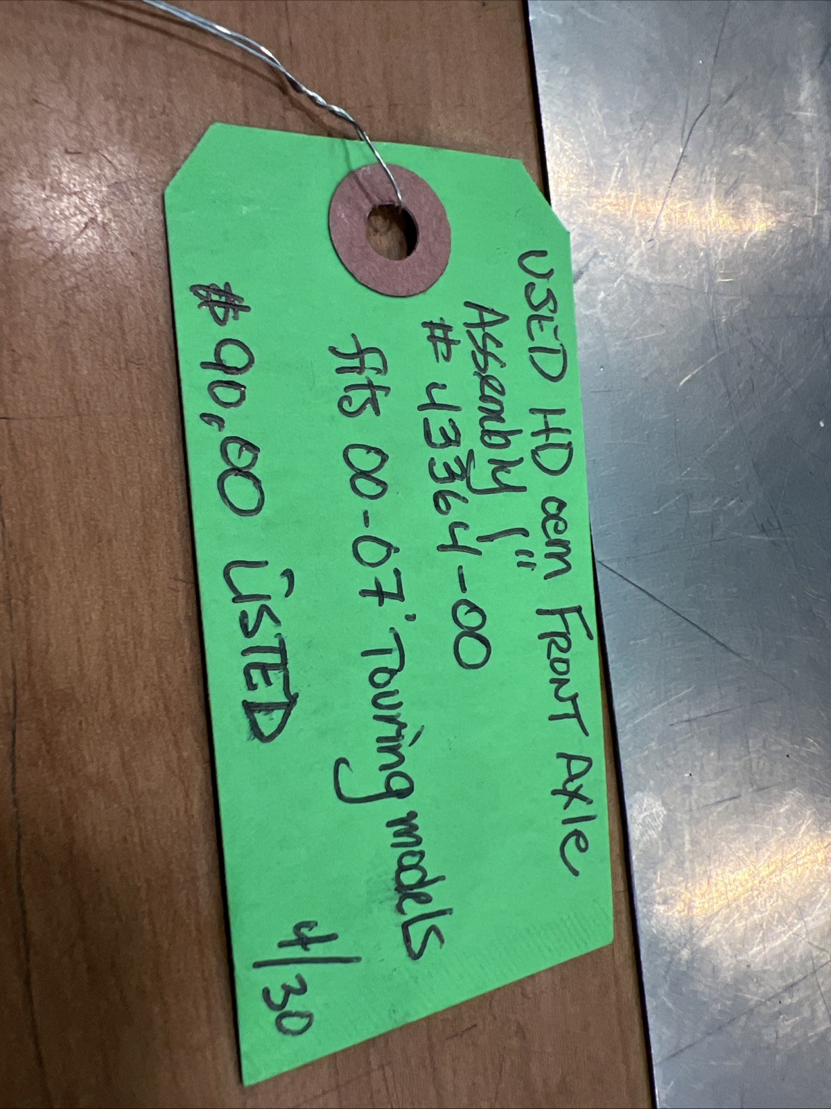 Harley Davidson oem Front Axle Assembly 1” #43364-00. Condition is used. Fits 00-07’ Touring models buyer is responsible for fitment and applications
