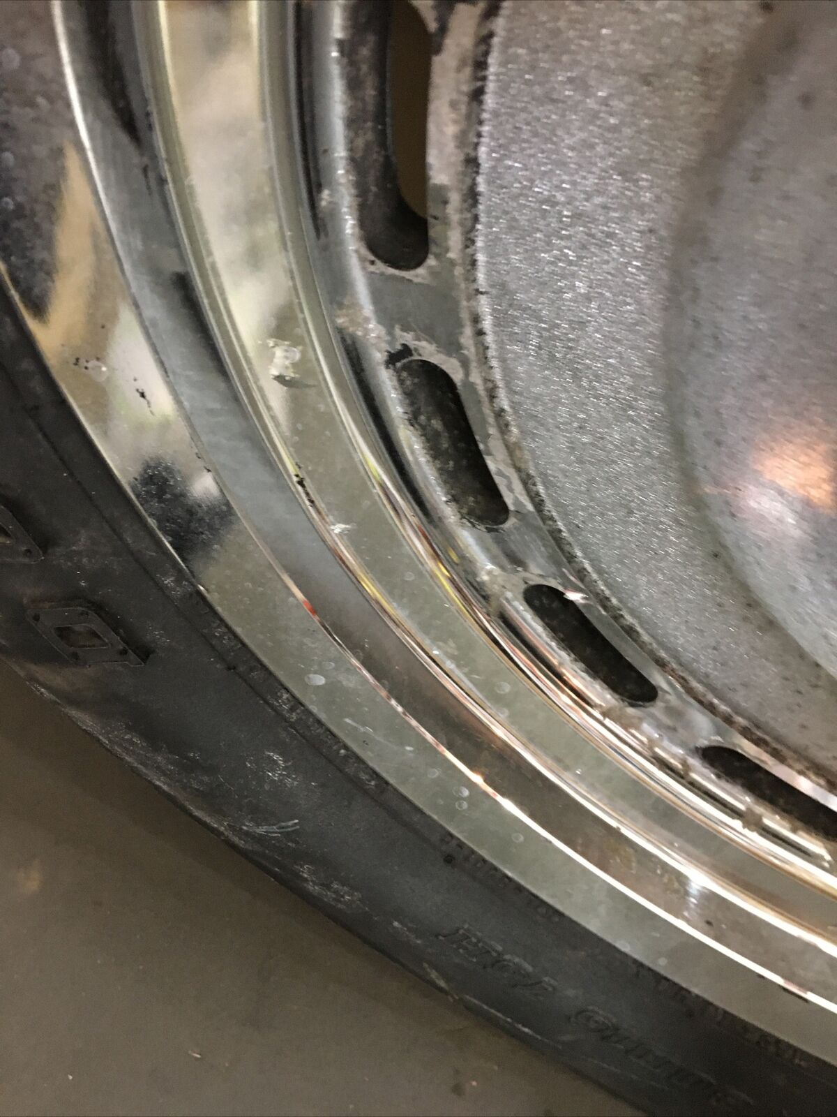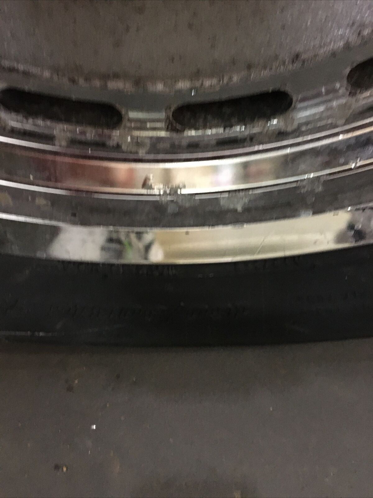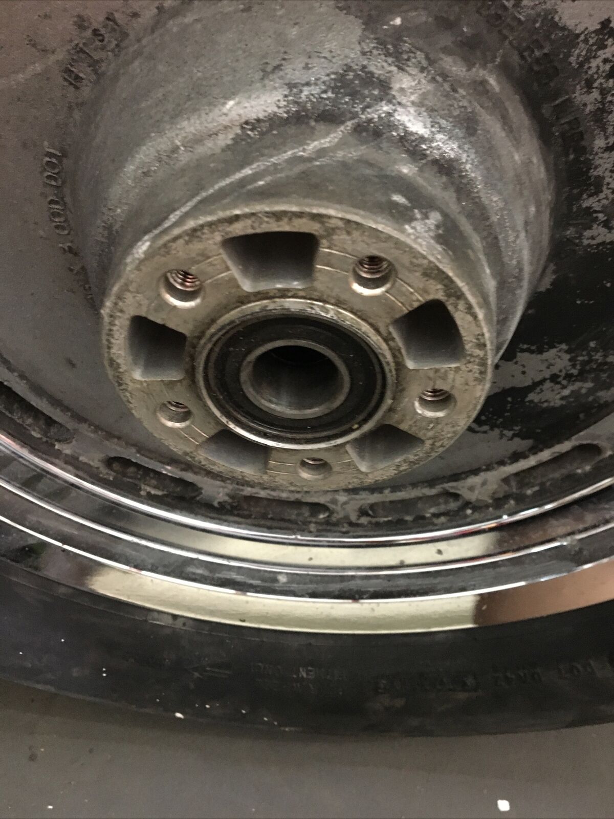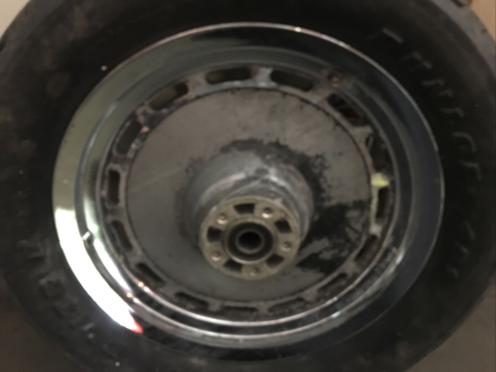 Condition is used as seen in pictures. Chrome pitting and flaking . Tire would have to be discarded before shipping. 1”axle fits 03-07’ FLST, FLSTC, FLSTN and 03-06’ FLSTF, 03-05’ FXST, FXSTB, FXSTS models buyer is responsible for fitment and applications